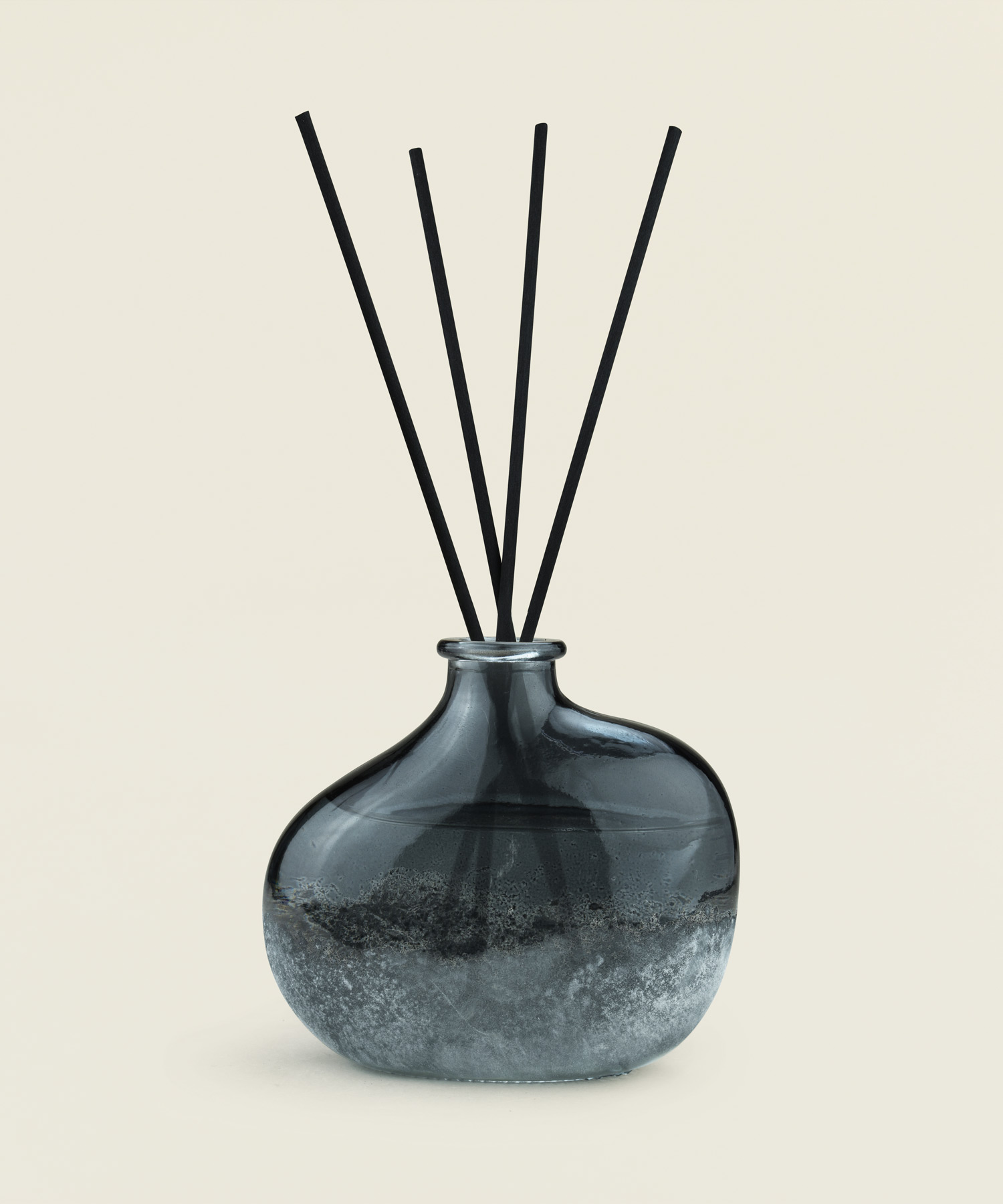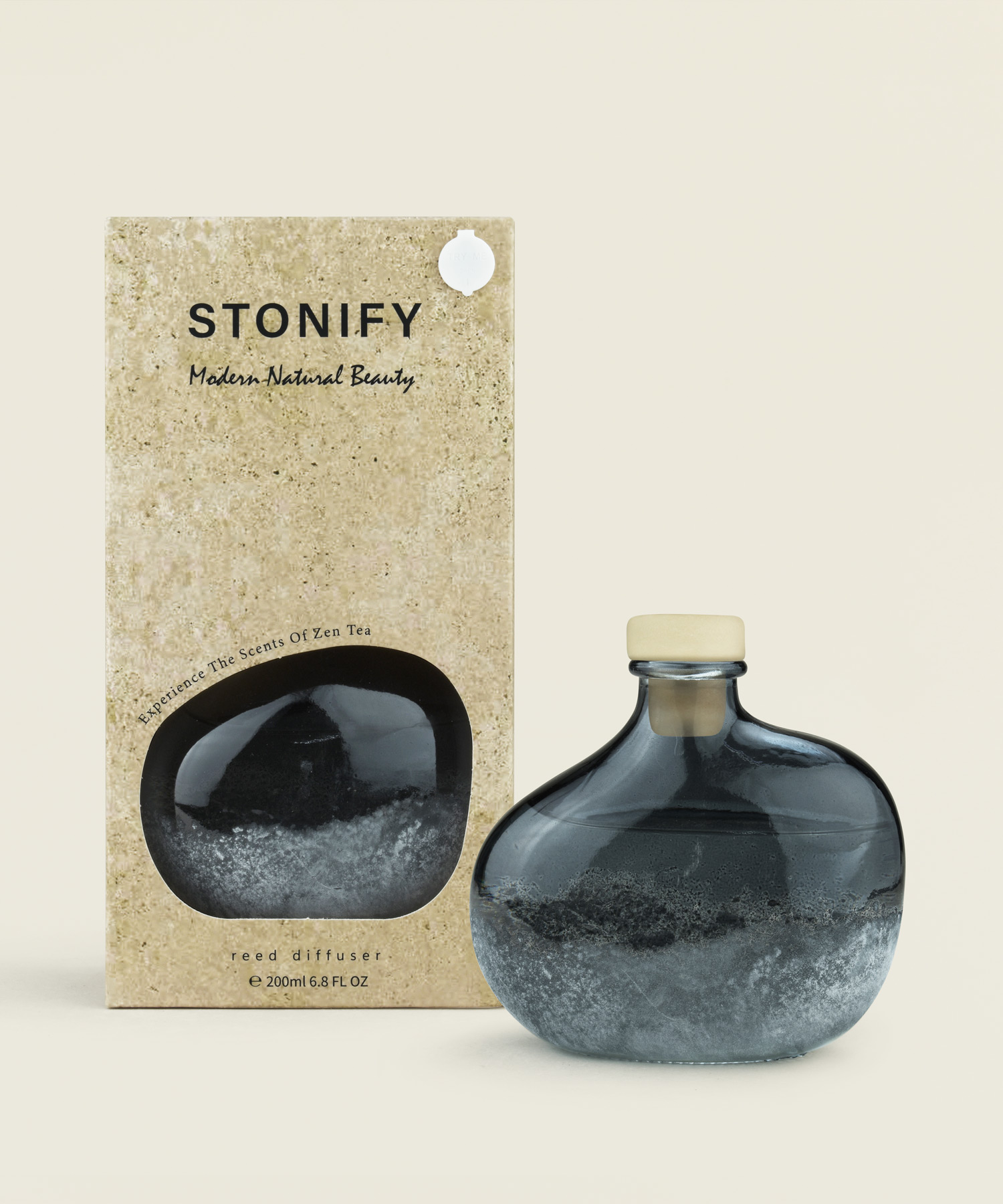 Υλικό κατασκευής: Γυάλινο μπουκάλι stone effect, αρωματικό έλαιο Zen Tea, μαύρα sticks διάχυσης