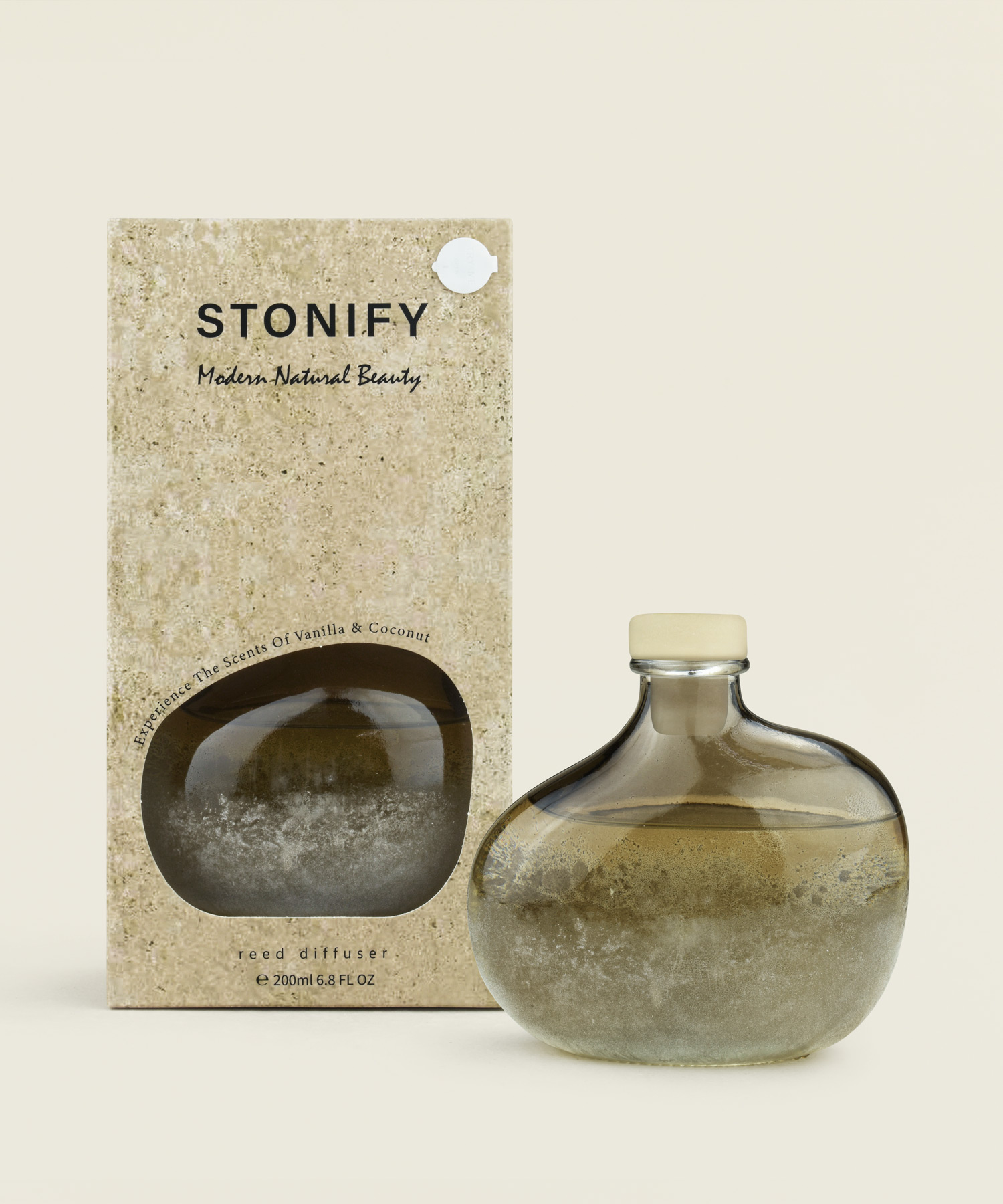 Υλικό κατασκευής: Γυάλινο μπουκάλι stone effect, αρωματικό έλαιο Vanilla & Coconut, μαύρα sticks διάχυσης