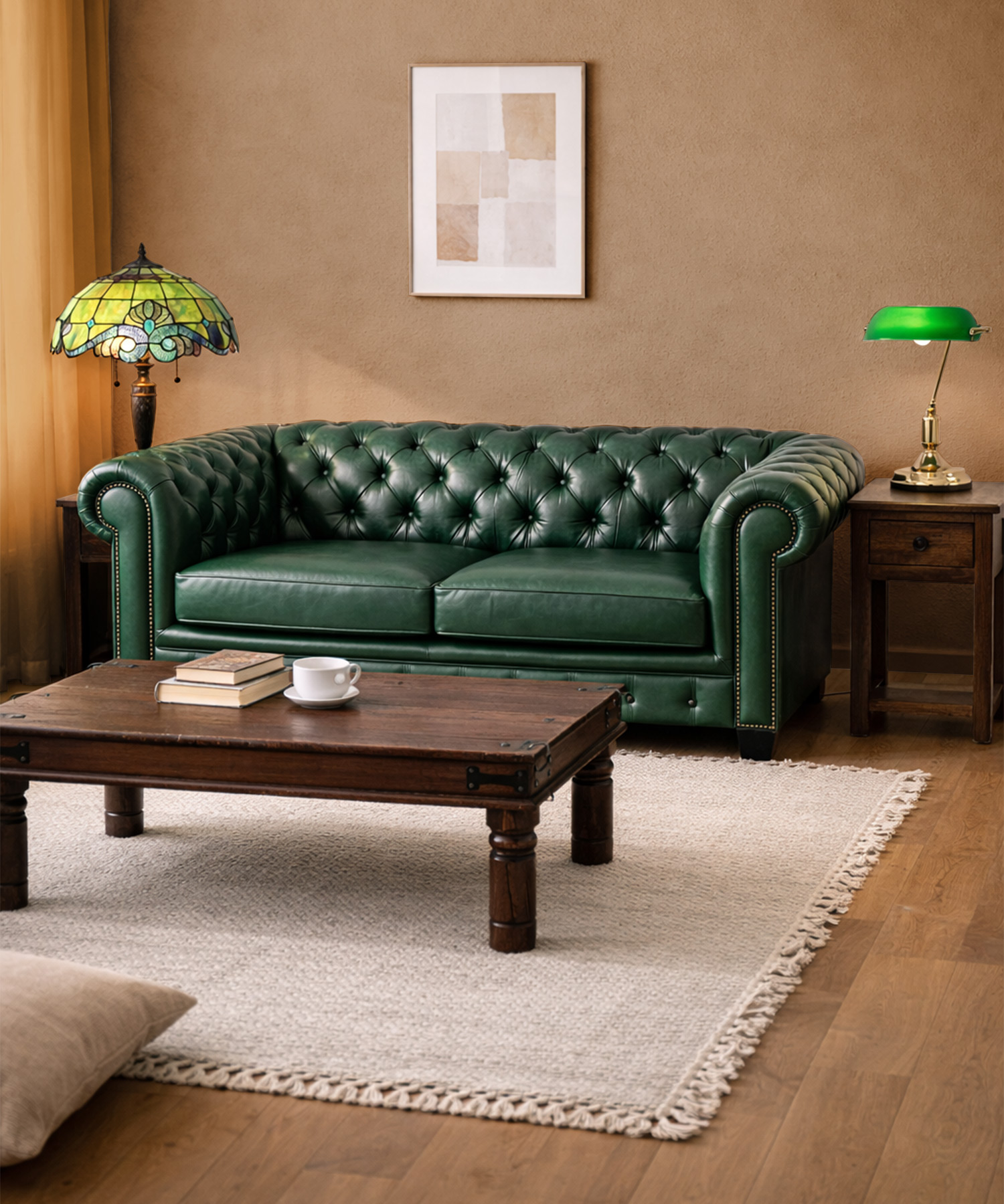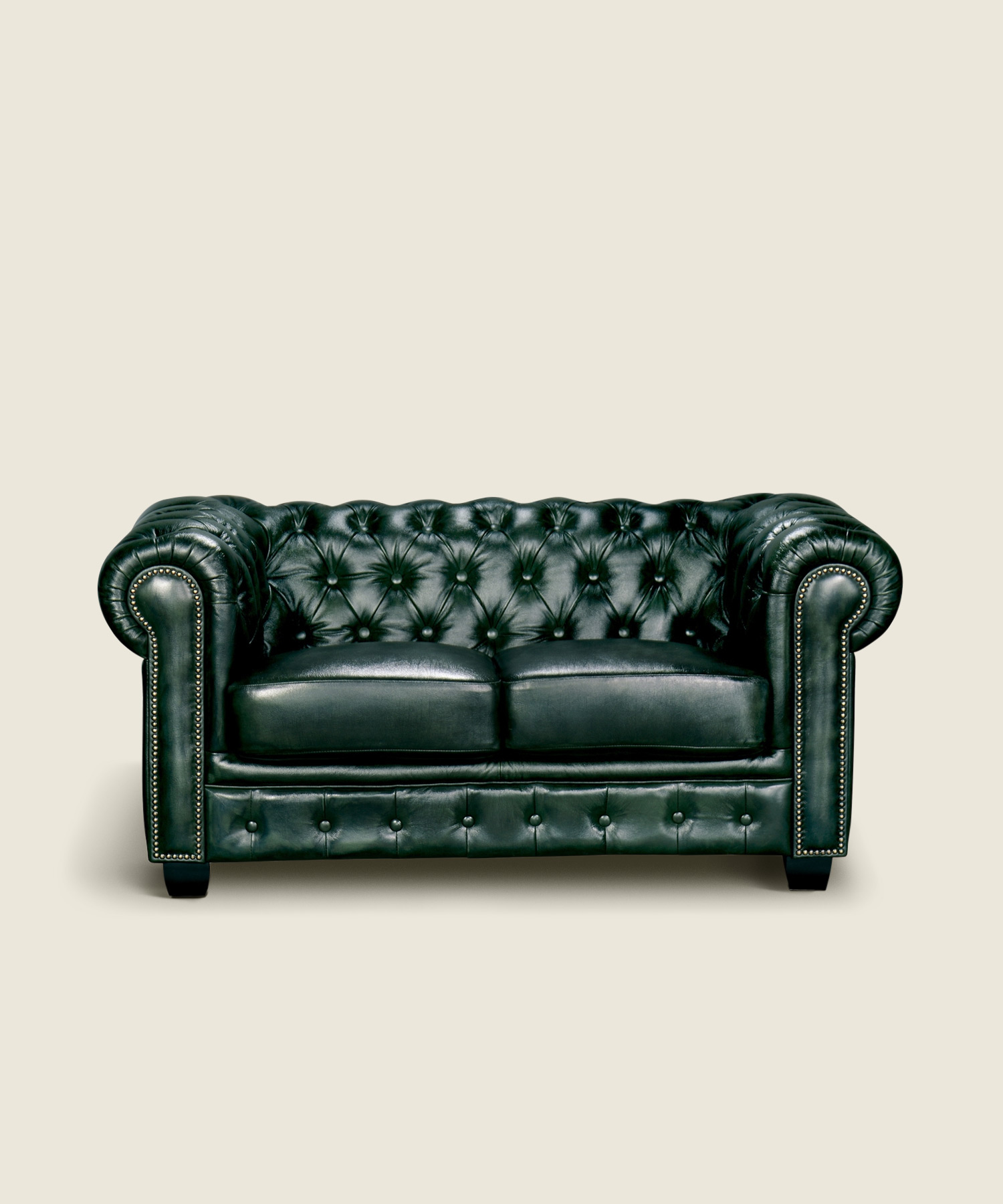 Δερμάτινος διθέσιος καναπές Chesterfield σε πράσινη αντικέ απόχρωση, κατασκευασμένος από γνήσιο δέρμα Buffalo. Ο κλασικός σχεδιασμός του τον καθιστά κατάλληλο για καθιστικό ή σαλόνι αλλά και επαγγελματικούς χώρους με χώρο αναμονής.