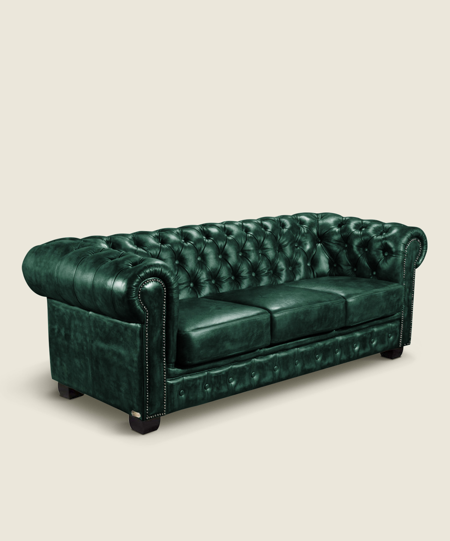 Δερμάτινος τριθέσιος καναπές Chesterfield σε πράσινη αντικέ απόχρωση, κατασκευασμένος από γνήσιο δέρμα Buffalo. Ο κλασικός σχεδιασμός του τον καθιστά κατάλληλο για καθιστικό ή σαλόνι αλλά και επαγγελματικούς χώρους με χώρο αναμονής.