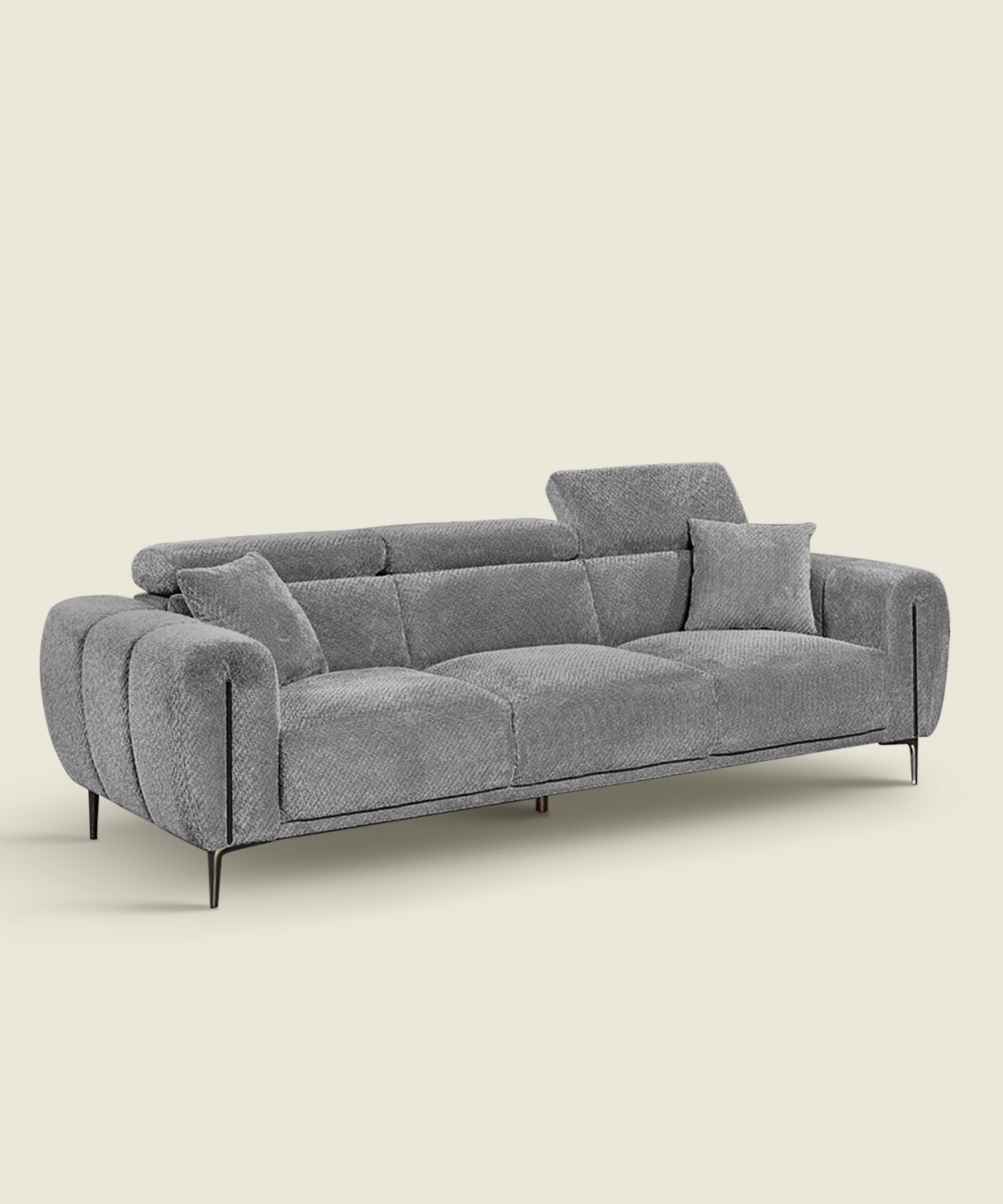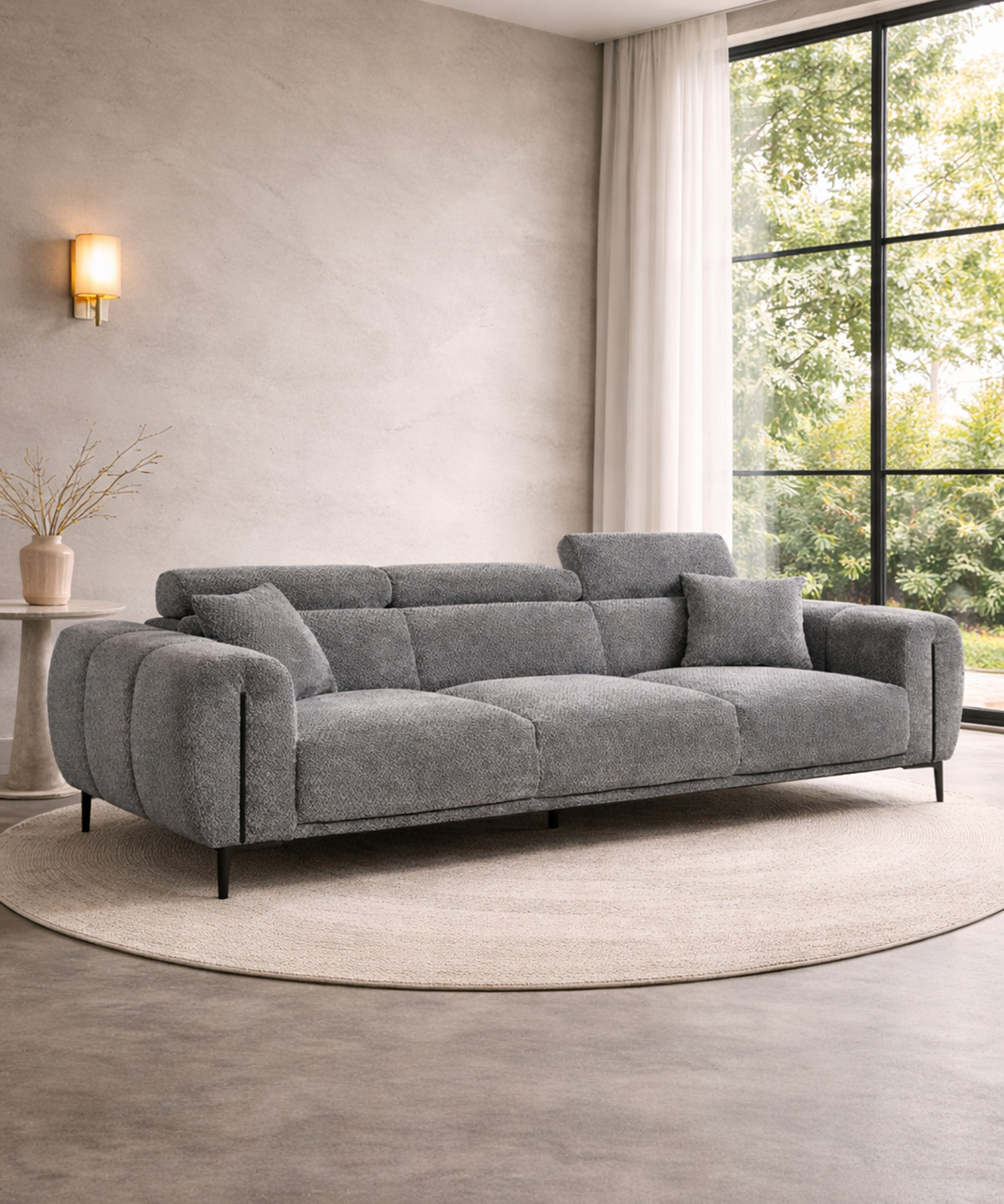 Υφασμάτινος τριθέσιος καναπές σε σκούρο γκρι χρώμα, με επένδυση teddy και άνετο βάθος καθίσματος κατάλληλος για καθημερινή χρήση σε σαλόνι ή καθιστικό, αλλά και σε επαγγελματικούς χώρους υποδοχής.