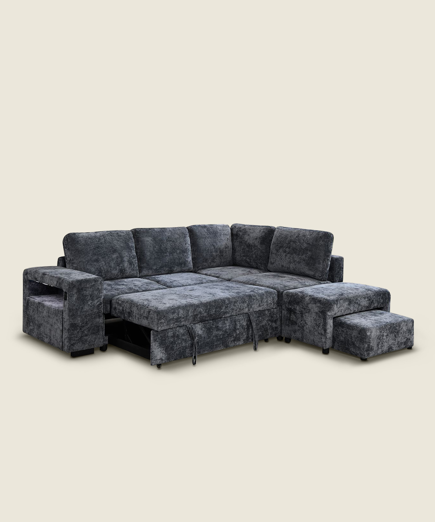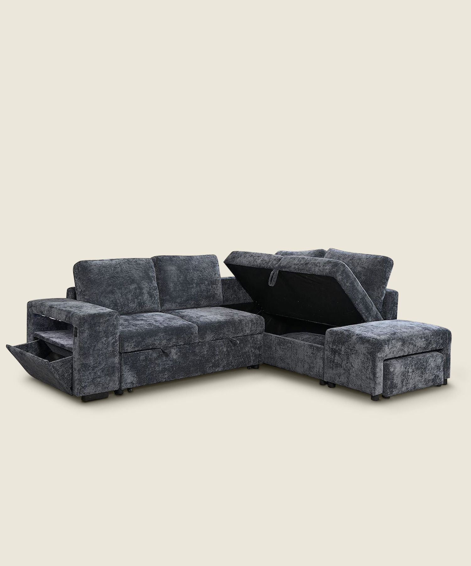 Υφασμάτινος γωνιακός καναπές Revo αριστερής γωνίας, σε ανθρακί χρώμα, που μετατρέπεται σε κρεβάτι και διαθέτει μπράτσο με αποθηκευτικό χώρο, φωτιζόμενο ράφι και δύο επιπλέον σκαμπό για μεγαλύτερη ευελιξία στον χώρο.