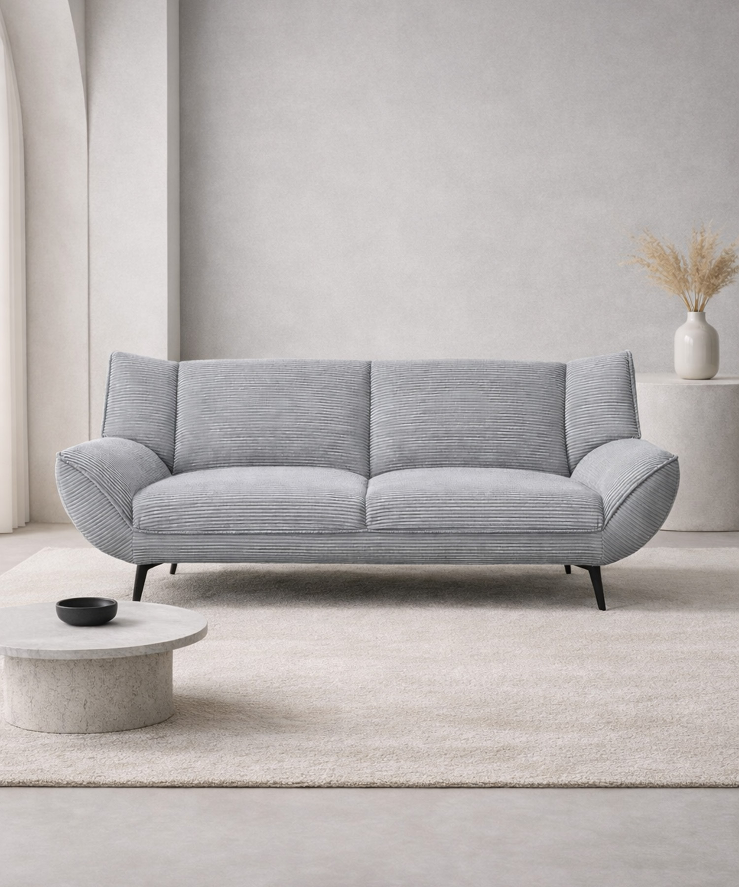 Διθέσιος καναπές Rowan με επένδυση από ύφασμα κοτλέ σε γκρι χρώμα, σχεδιασμένος για καθημερινή χρήση, με άνετο κάθισμα και διαστάσεις που ταιριάζουν σε μικρούς και μεσαίους χώρους.