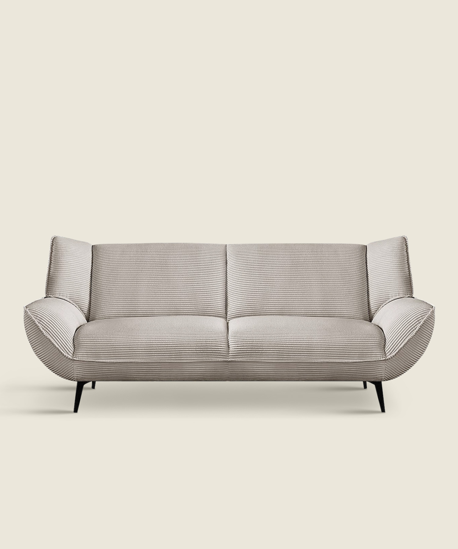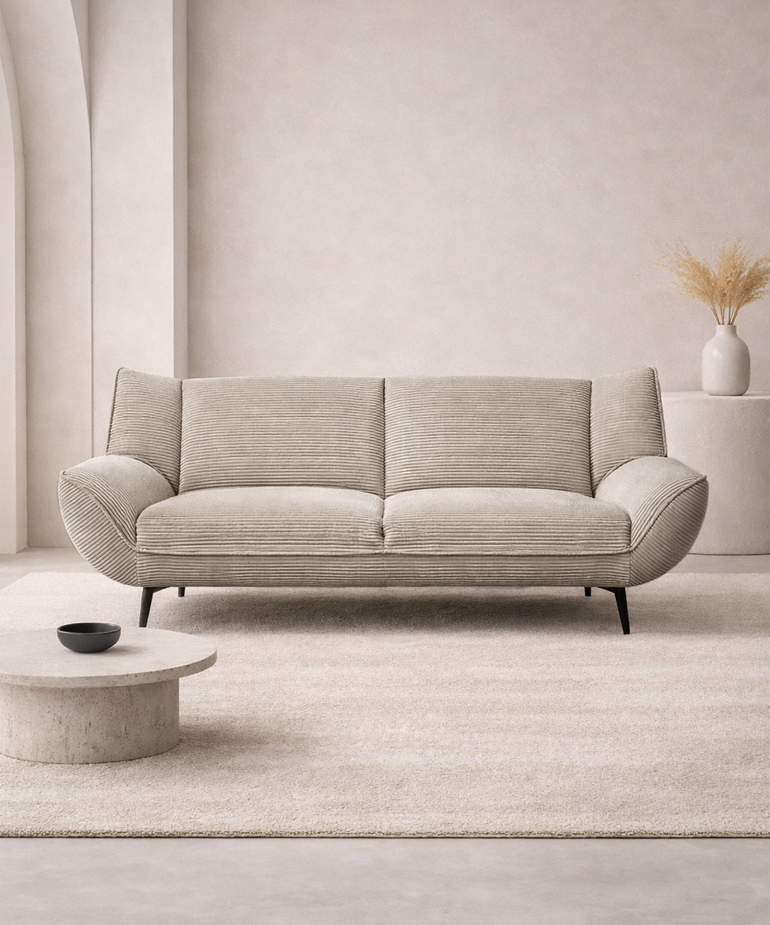 Τριθέσιος καναπές Rowan με επένδυση από ύφασμα κοτλέ σε μπεζ χρώμα, κατάλληλος για καθημερινή χρήση, προσφέροντας περισσότερες θέσεις καθίσματος και εξυπηρετώντας άνετα μεσαίους και μεγάλους χώρους.