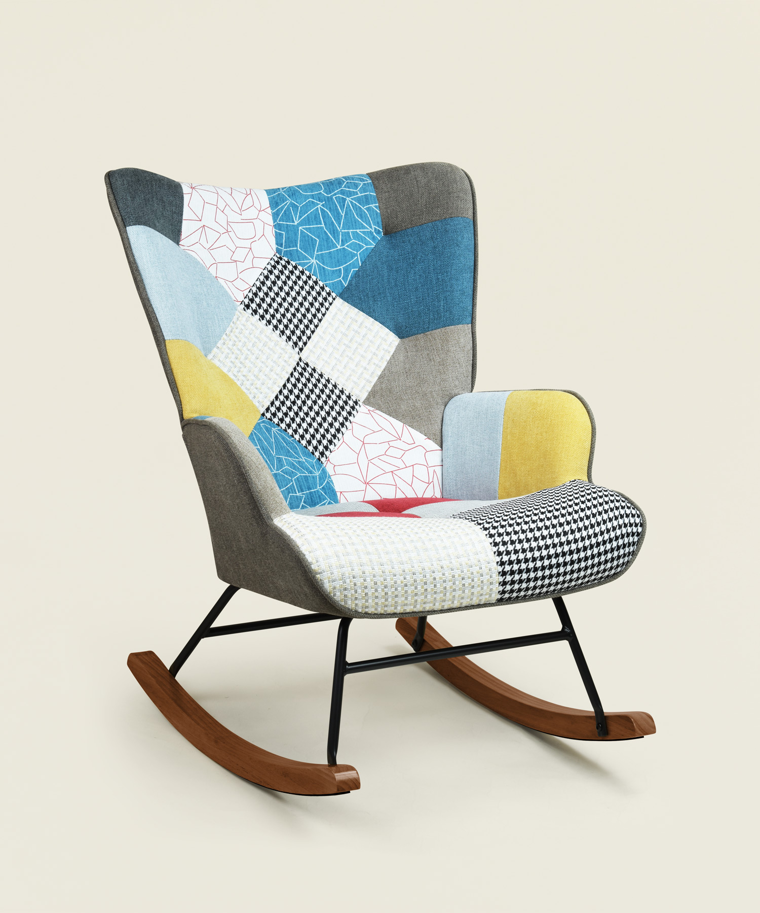 H Κουνιστή πολυθρόνα Lesli σε υφασμάτινο Patchwork σχέδιο, με μαύρη μεταλλική βάση και ξύλινα πόδια σε καρυδί χρώμα, προσφέρει έναν ζωντανό και ιδιαίτερο χαρακτήρα στον χώρο, συνδυάζοντας άνετη κατασκευή, μοντέρνα αισθητική και χρώματα που ανανεώνουν κάθε σαλόνι ή καθιστικό.