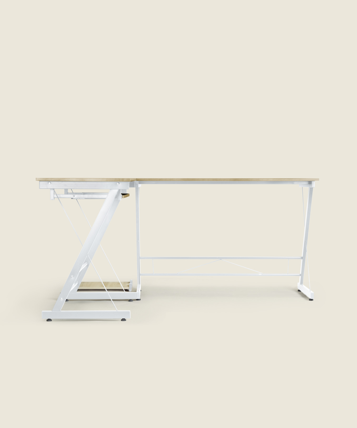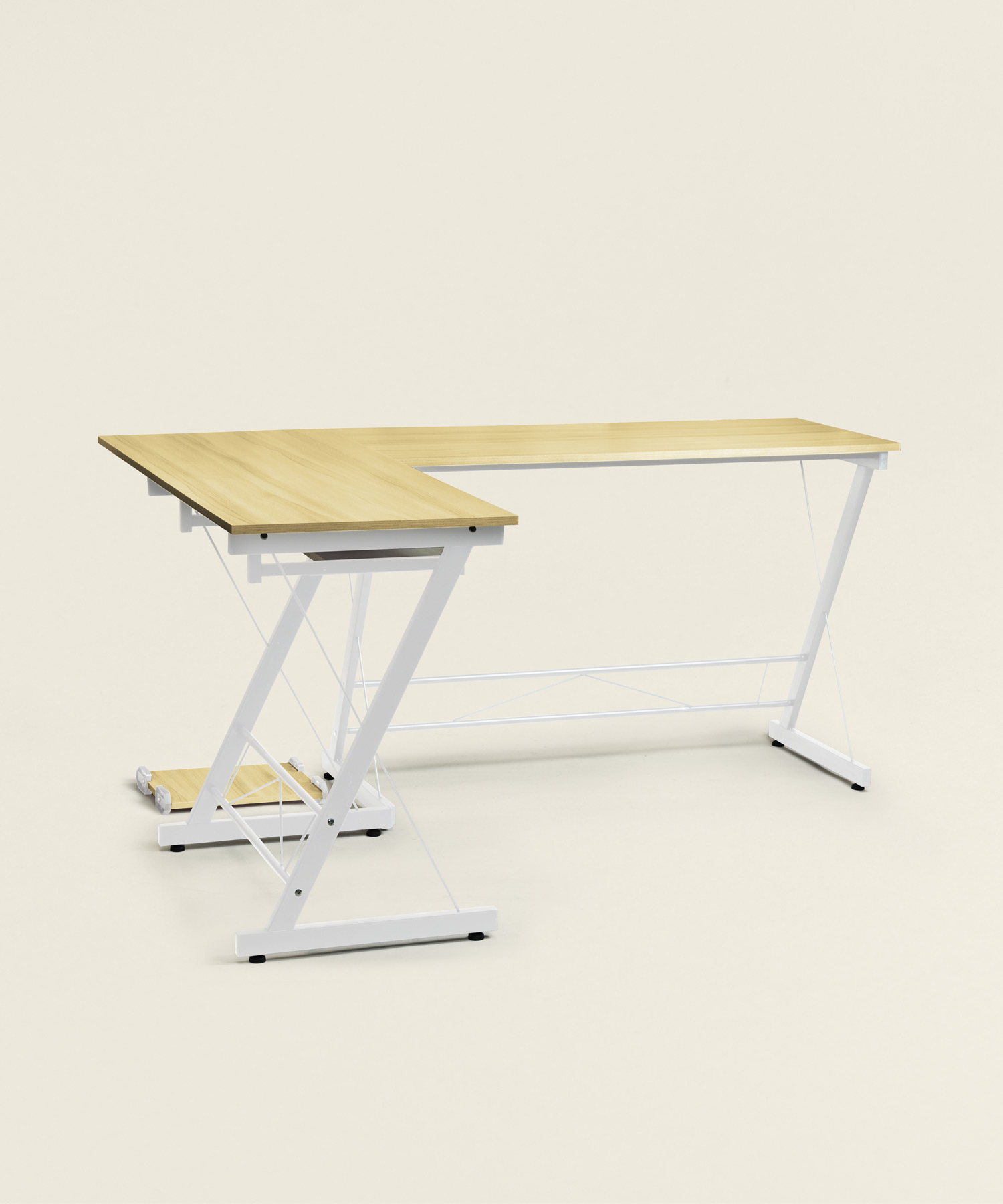 Γραφείο Corner με αριστερή γωνία, λευκό μεταλλικό σκελετό και ξύλινη επιφάνεια σε φυσικό χρώμα