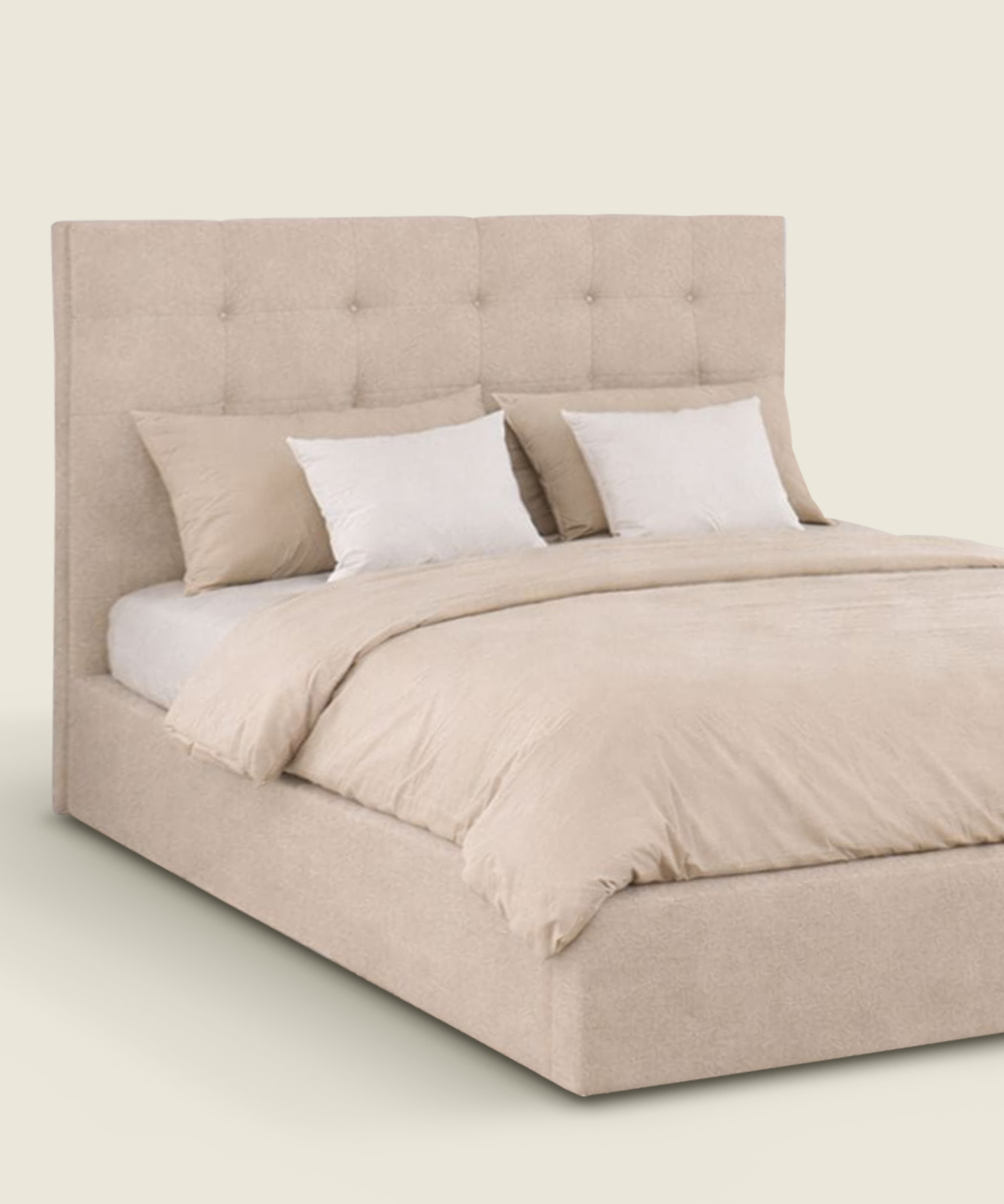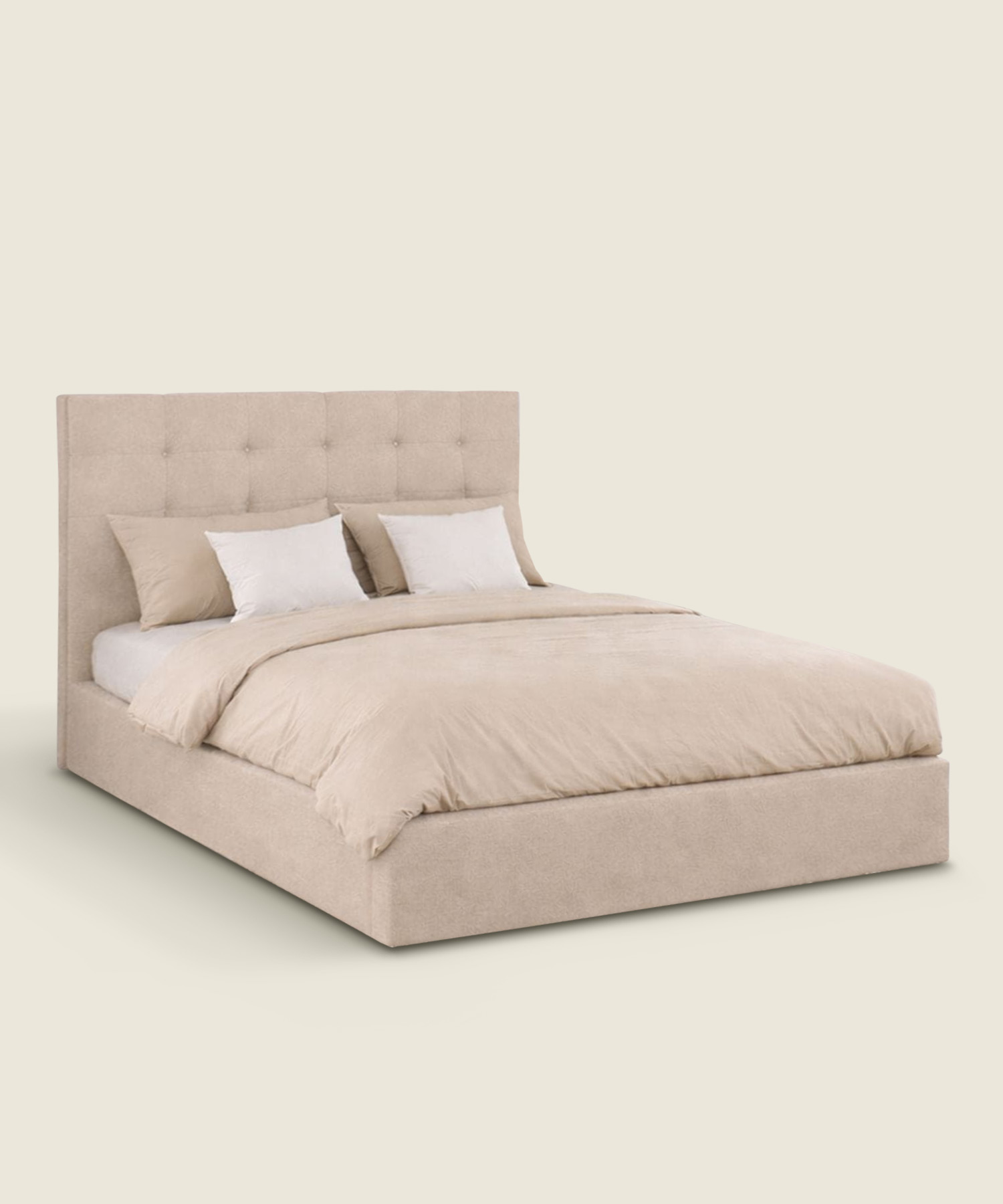 Υπέρδιπλο υφασμάτινο κρεβάτι με αποθηκευτικό χώρο, σχεδιασμένο για στρώμα 160×200εκ., σε μπεζ χρώμα, με καπιτονέ κεφαλάρι που προσθέτει άνεση και επιπλέον αποθηκευτικό χώρο στο υπνοδωμάτιο.