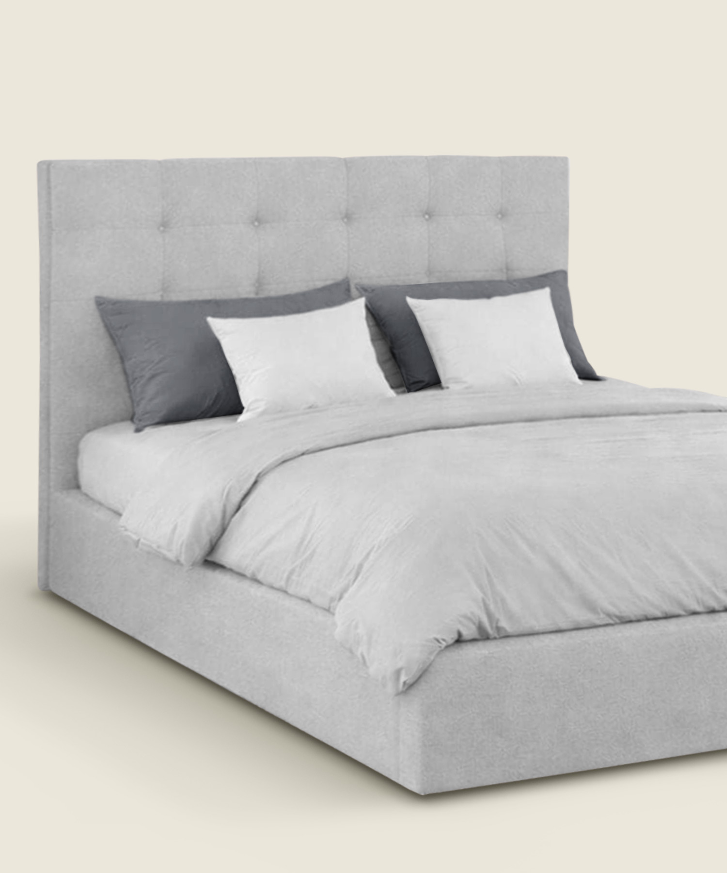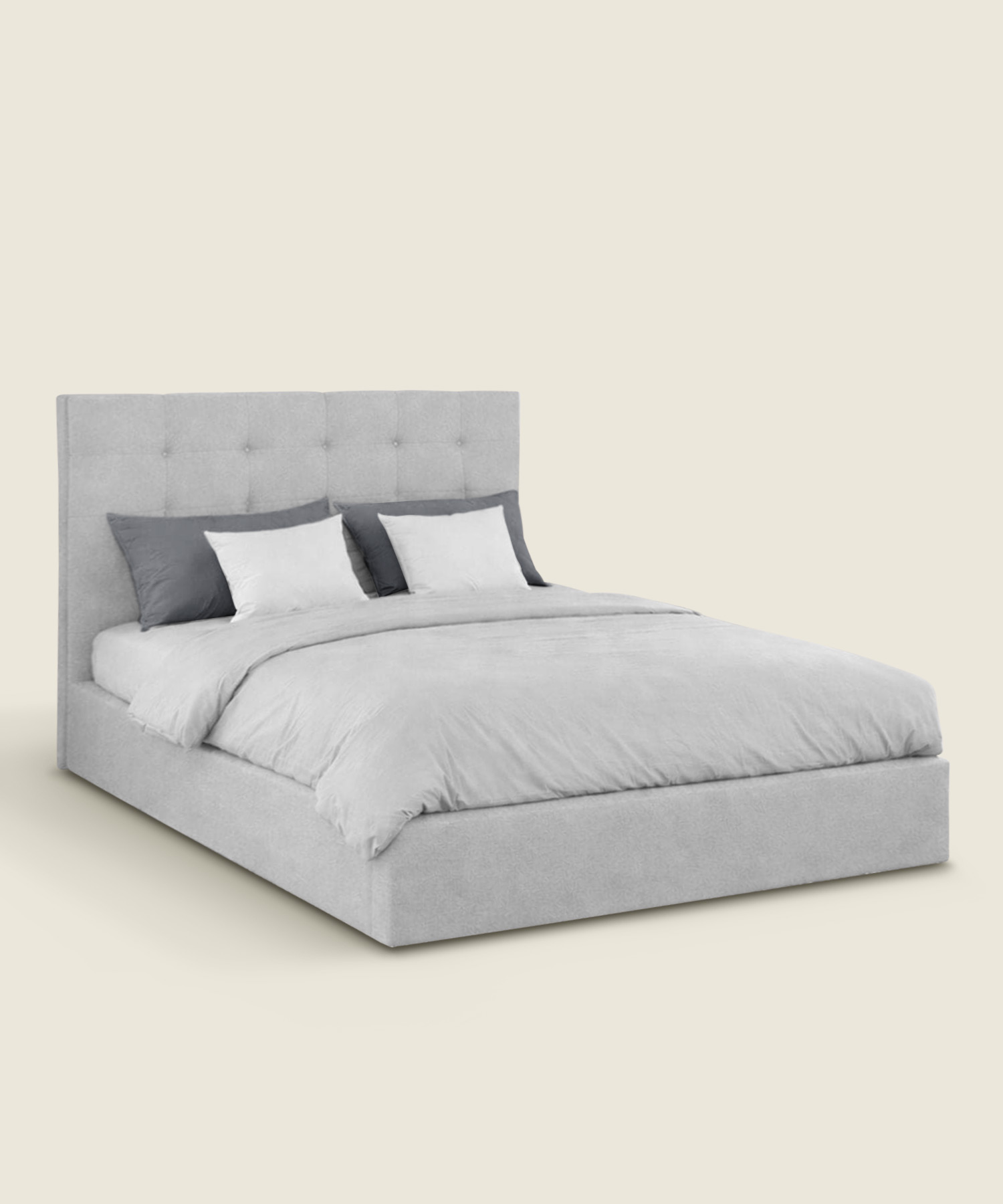 Υπέρδιπλο υφασμάτινο κρεβάτι με αποθηκευτικό χώρο, σχεδιασμένο για στρώμα 160×200εκ., σε γκρι χρώμα, με καπιτονέ κεφαλάρι που προσθέτει άνεση και επιπλέον αποθηκευτικό χώρο στο υπνοδωμάτιο.