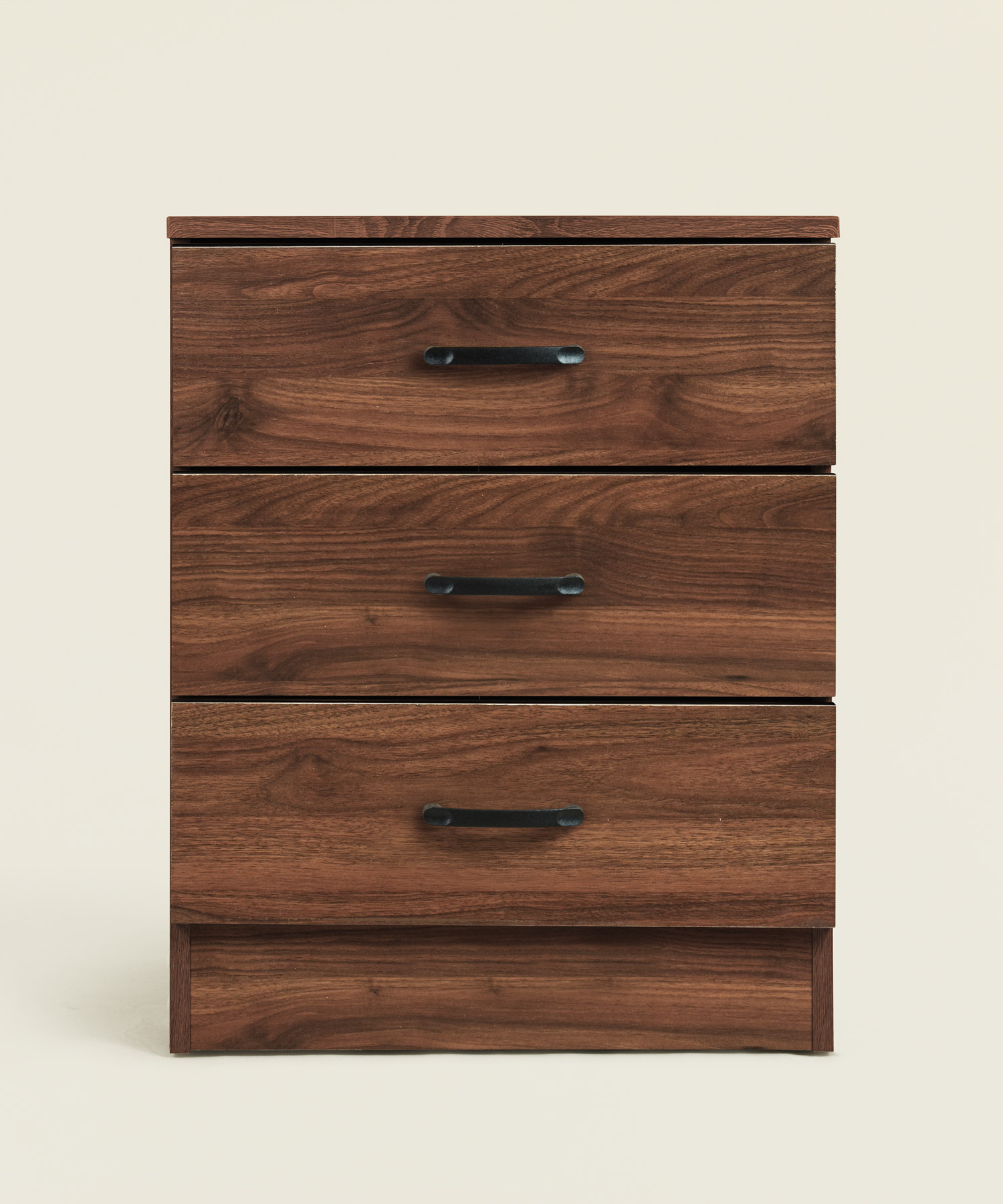 Κομοδίνο σε απόχρωση καρυδί με τρία συρτάρια για πρακτική αποθήκευση. Ιδανικό για χρήση δίπλα στο κρεβάτι σε κάθε υπνοδωμάτιο.