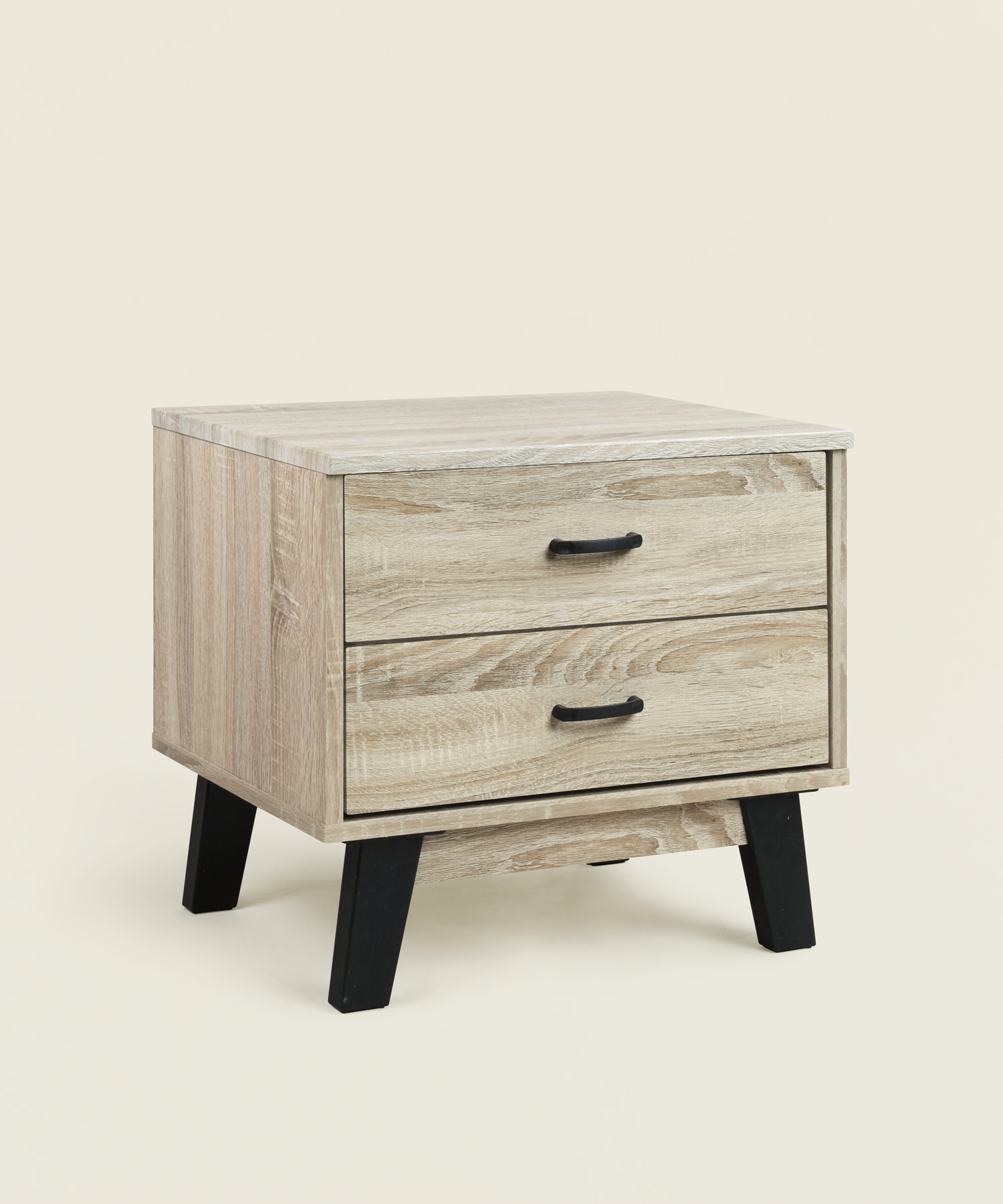 Το κομοδίνο Haber συνδυάζει συρτάρια σε χρώμα οξιά και μαύρα ξύλινα πόδια, δημιουργώντας ένα μοντέρνο και ισορροπημένο αποτέλεσμα. Διαθέτει δύο συρτάρια για πρακτική αποθήκευση, ιδανικό για κάθε υπνοδωμάτιο.