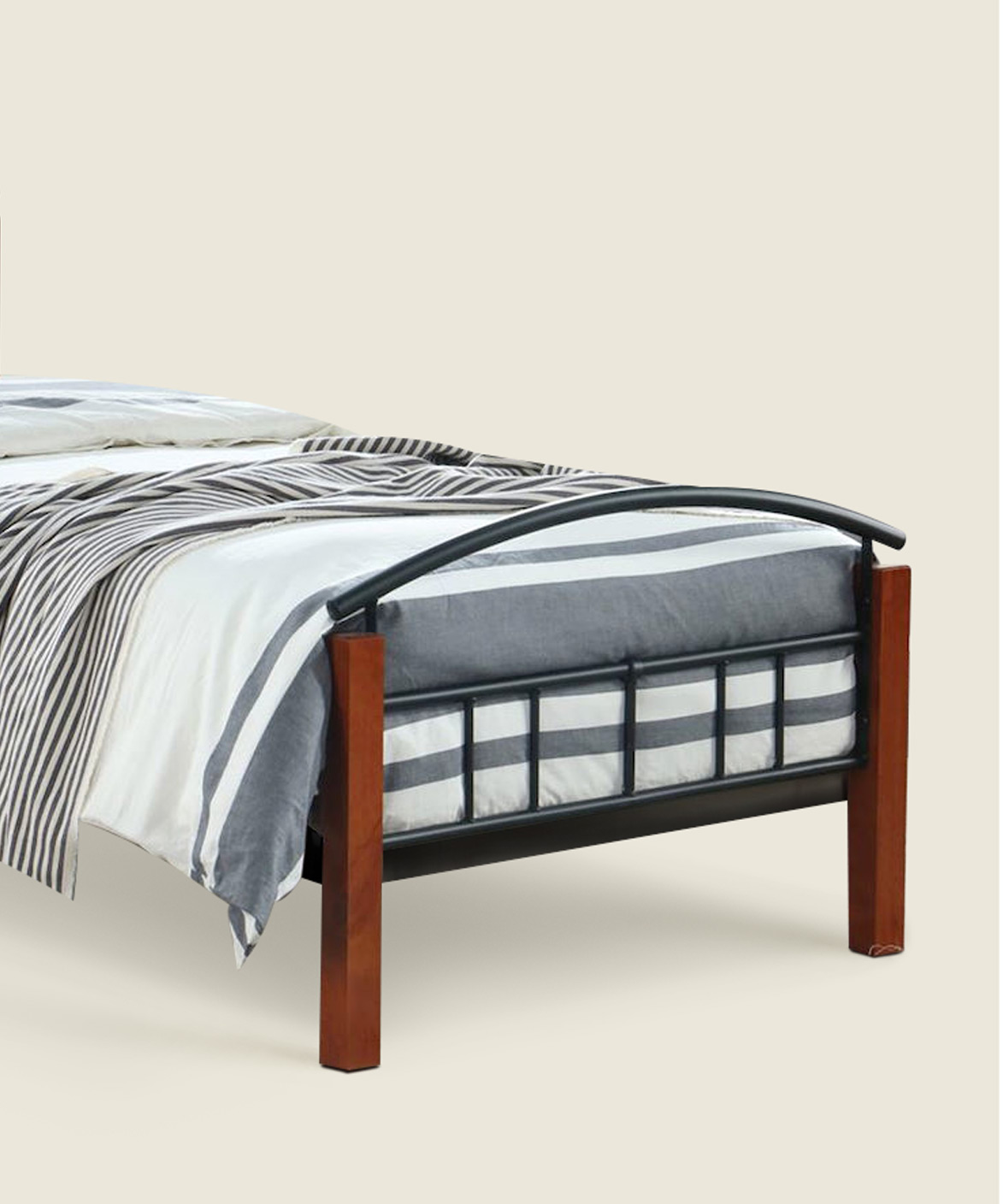 Το μονό κρεβάτι Albini διαθέτει μεταλλικό σκελετό σε μαύρο χρώμα και ξύλινα πόδια σε απόχρωση καρυδιάς. Ιδανικό για φοιτητικά, εφηβικά ή δωμάτια επισκεπτών.