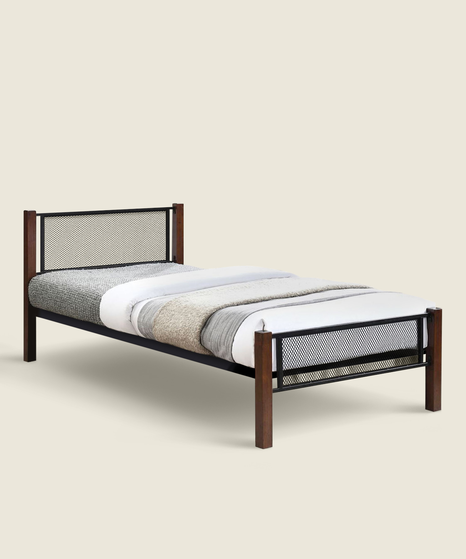 Μεταλλικό κρεβάτι με ξύλινες λεπτομέρειες, σχεδιασμένο για μονό στρώμα 90×190εκ., σε συνδυασμό μαύρου και καρυδί χρώματος, που ταιριάζει εύκολα σε νεανικούς και εφηβικούς χώρους.