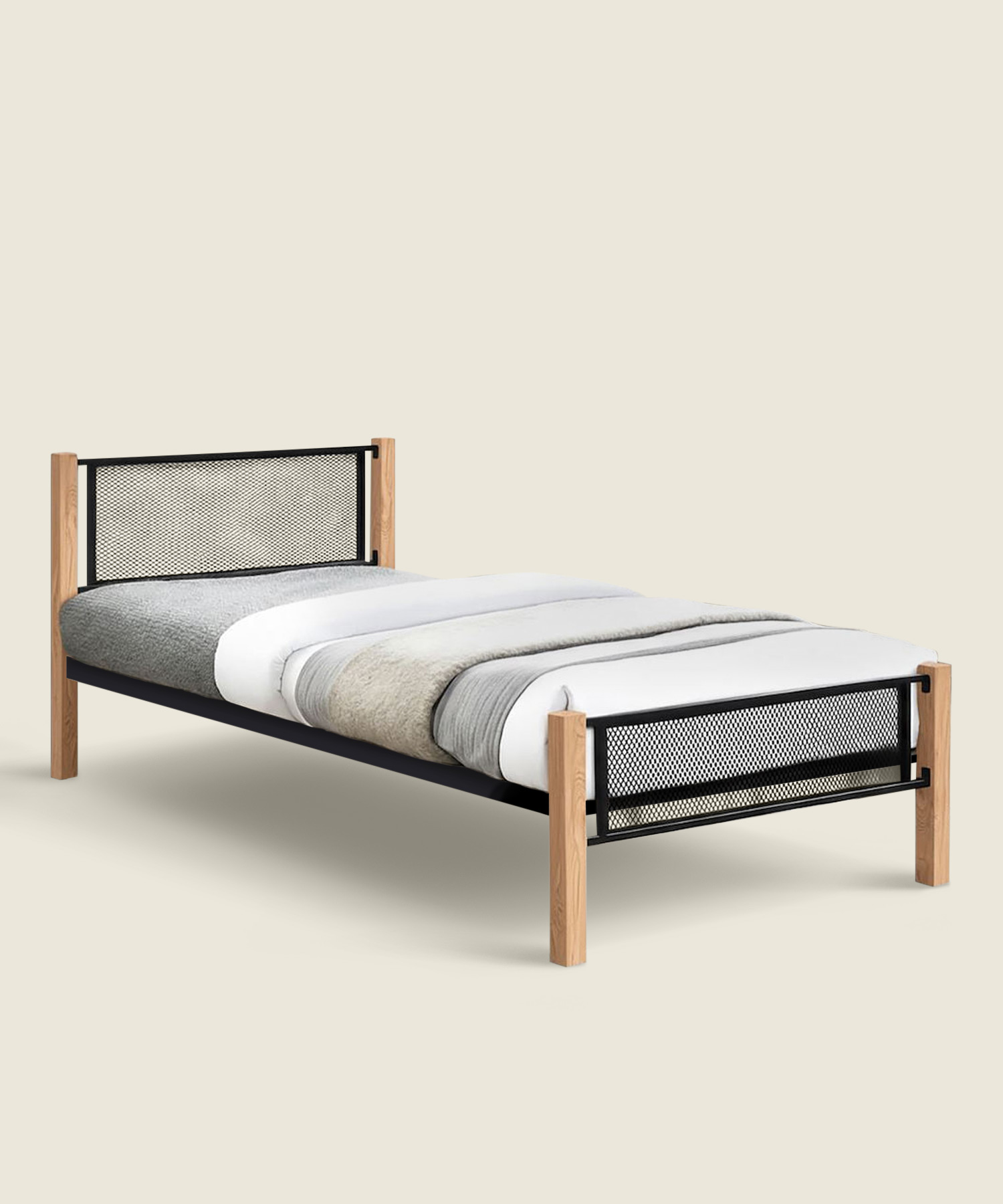 Μεταλλικό κρεβάτι με ξύλινες λεπτομέρειες, σχεδιασμένο για μονό στρώμα 90×190εκ., σε συνδυασμό μαύρου και φυσικού χρώματος, που ταιριάζει εύκολα σε νεανικούς και εφηβικούς χώρους.