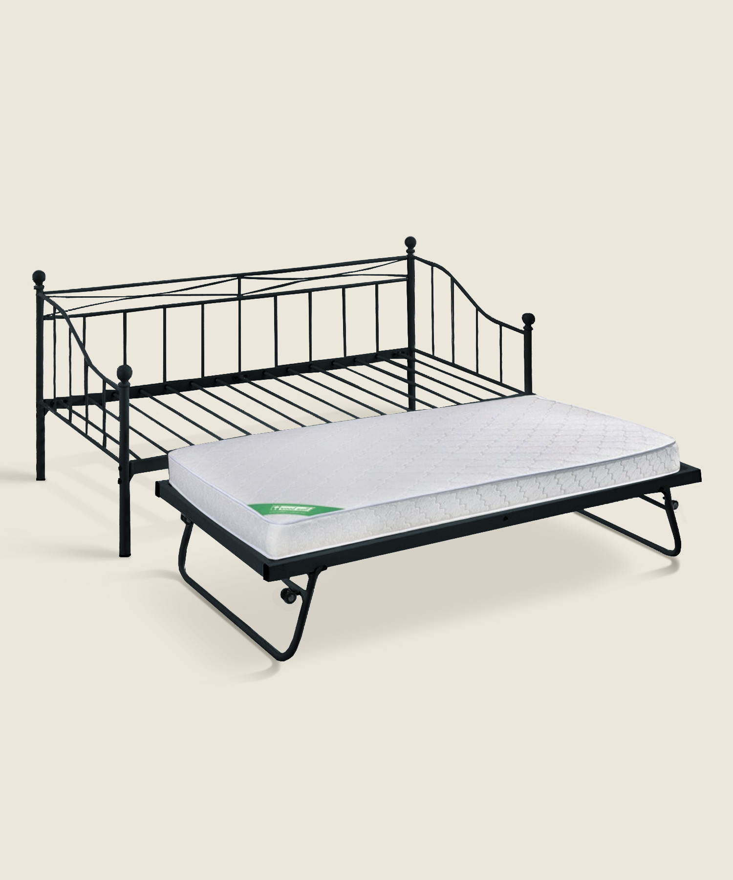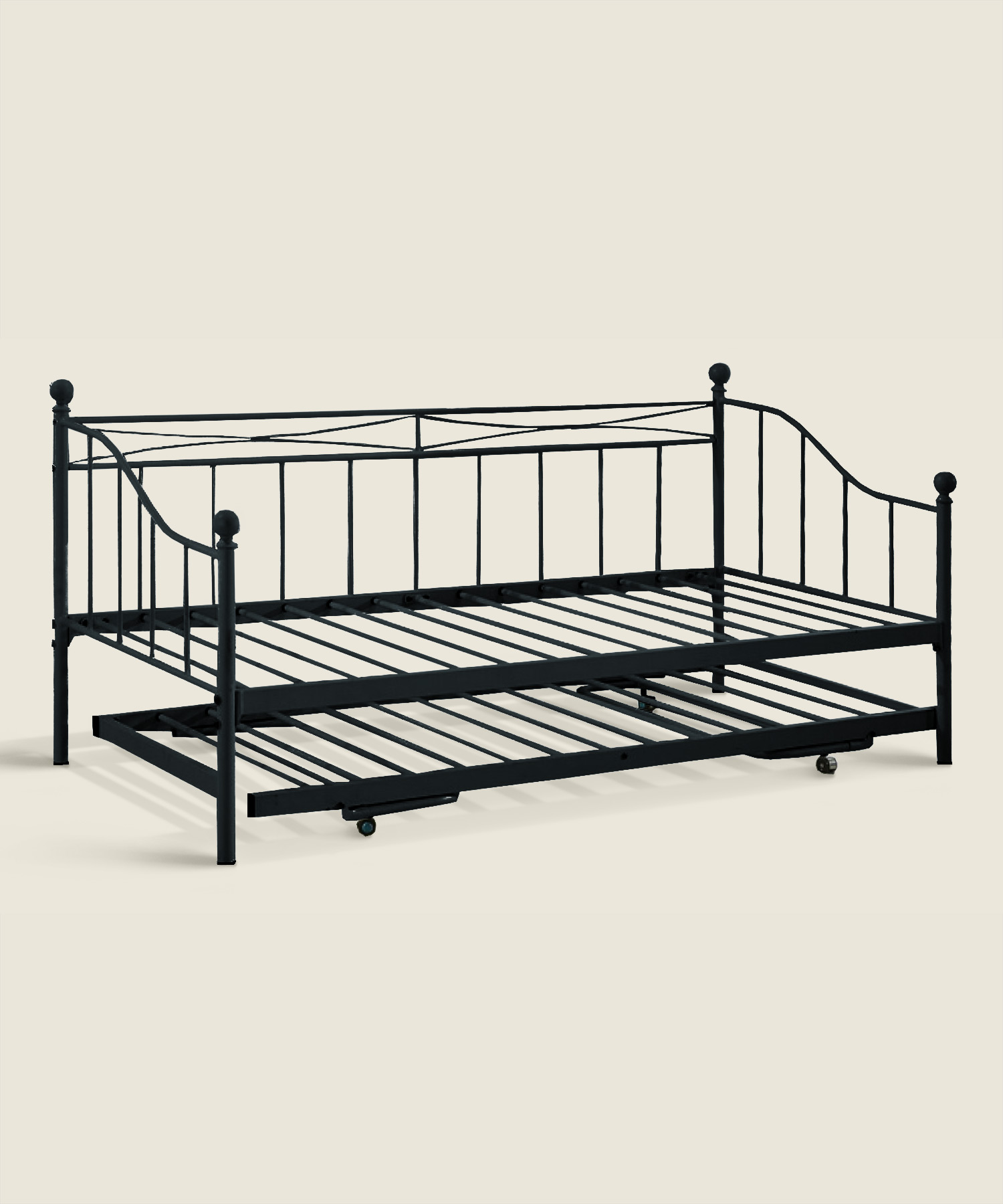 Μεταλλικό μονό κρεβάτι με βοηθητικό κρεβάτι ίδιων διαστάσεων, σχεδιασμένο ώστε όταν ενωθούν να σχηματίζουν διπλό κρεβάτι, σε μαύρο χρώμα για εύκολη ένταξη σε κάθε χώρο.