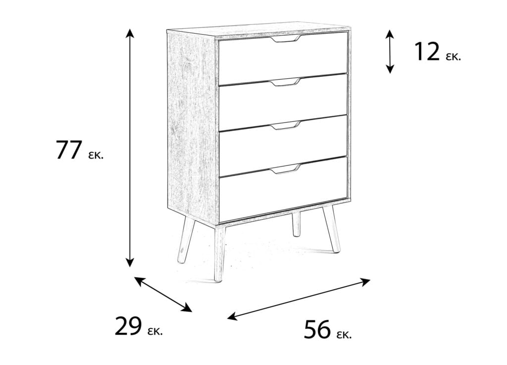 Η συρταριέρα Sarong με τέσσερα συρτάρια σε λευκό χρώμα προσφέρει κομψή minimal αισθητική και πρακτική οργάνωση, αποτελώντας ιδανική επιλογή για κάθε χώρο όπως υπνοδωμάτιο ή καθιστικό.