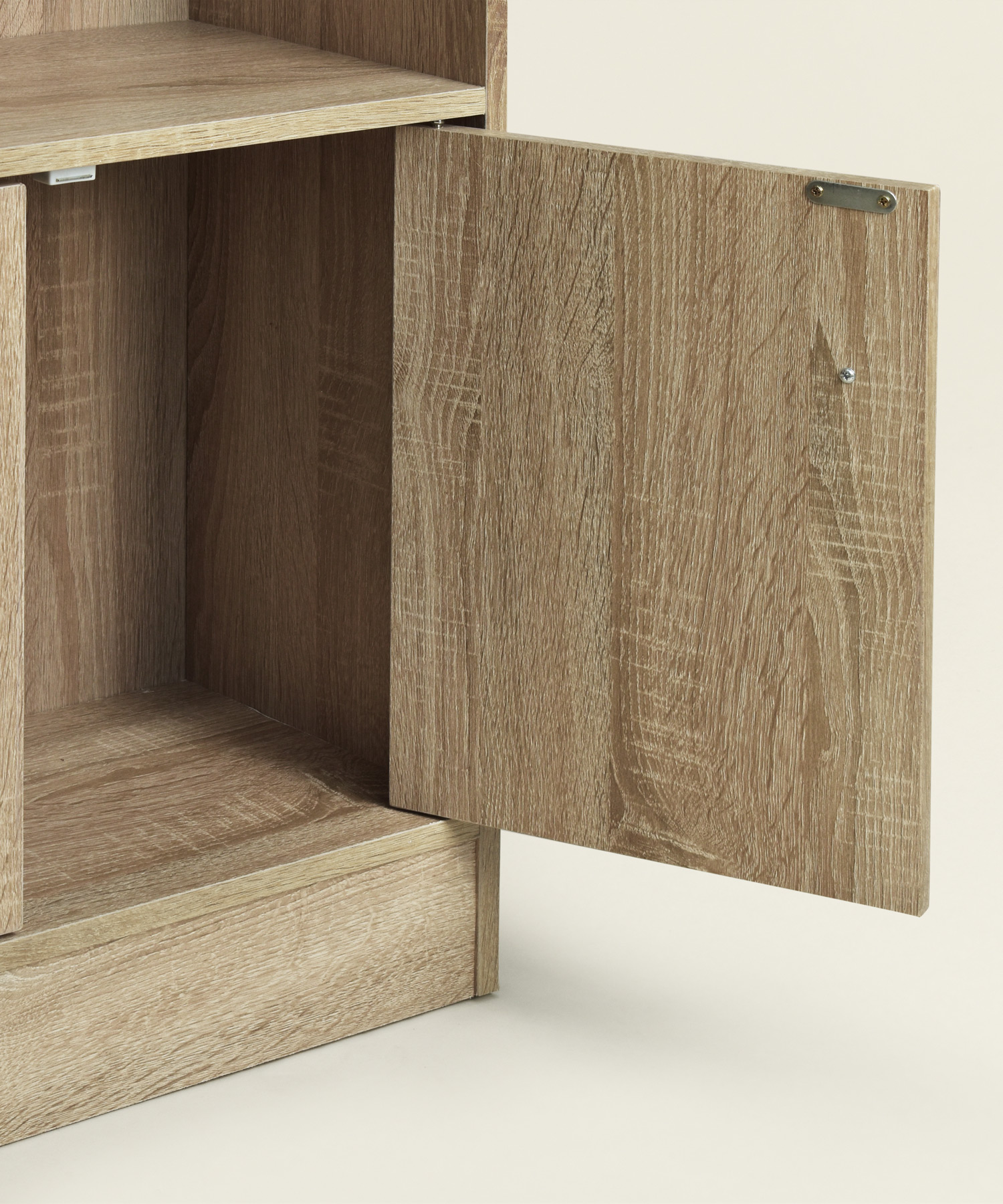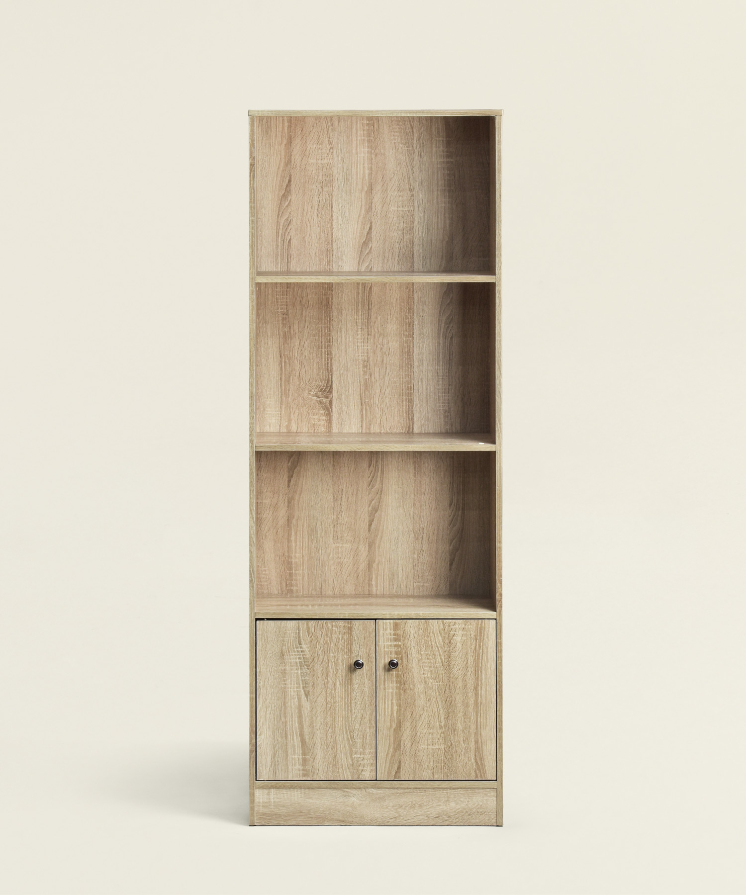 Βιβλιοθήκη σε απόχρωση οξιάς με ανοιχτά ράφια και κάτω ντουλάπι. Ιδανική για οργάνωση βιβλίων και αποθήκευση αντικειμένων.