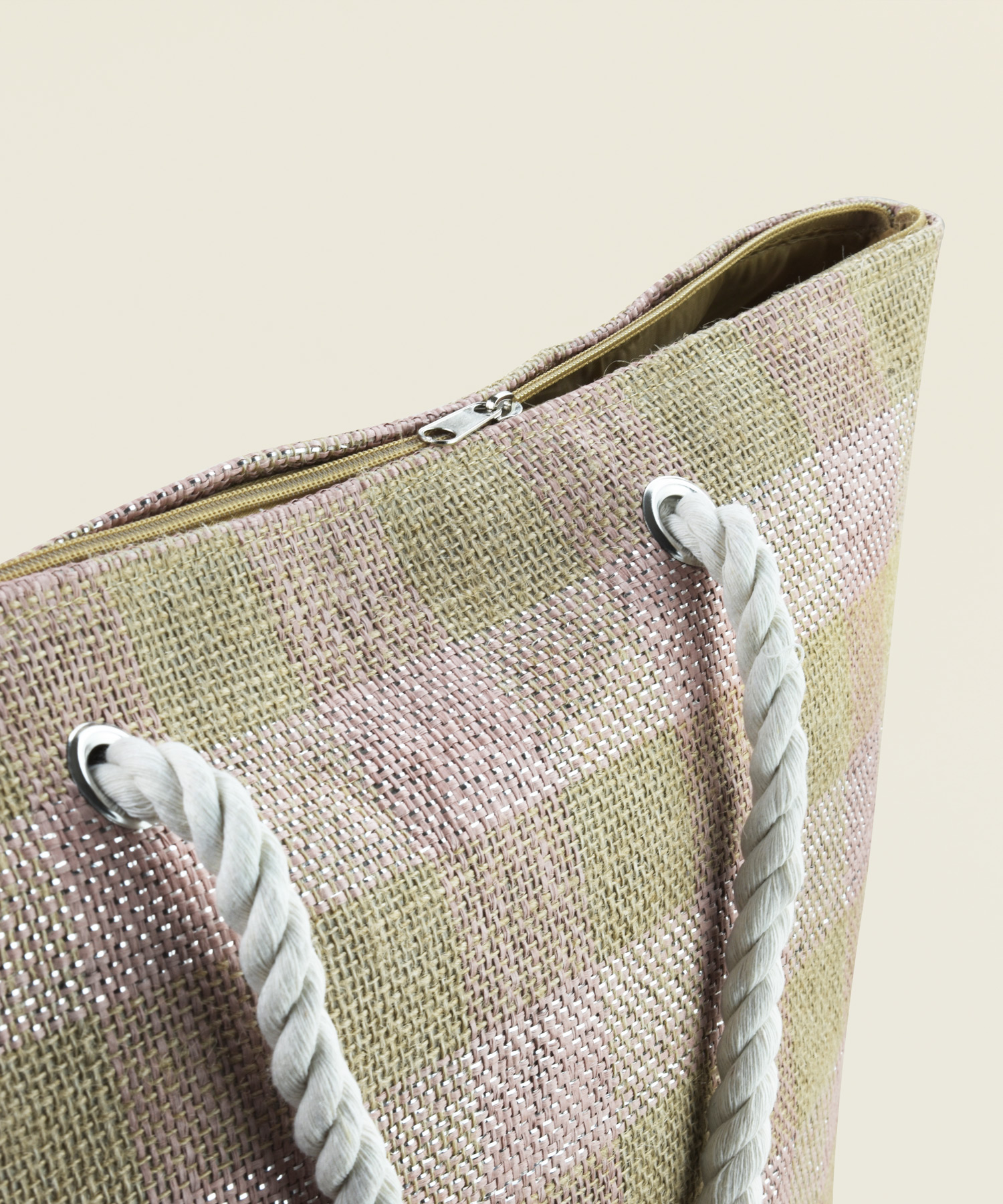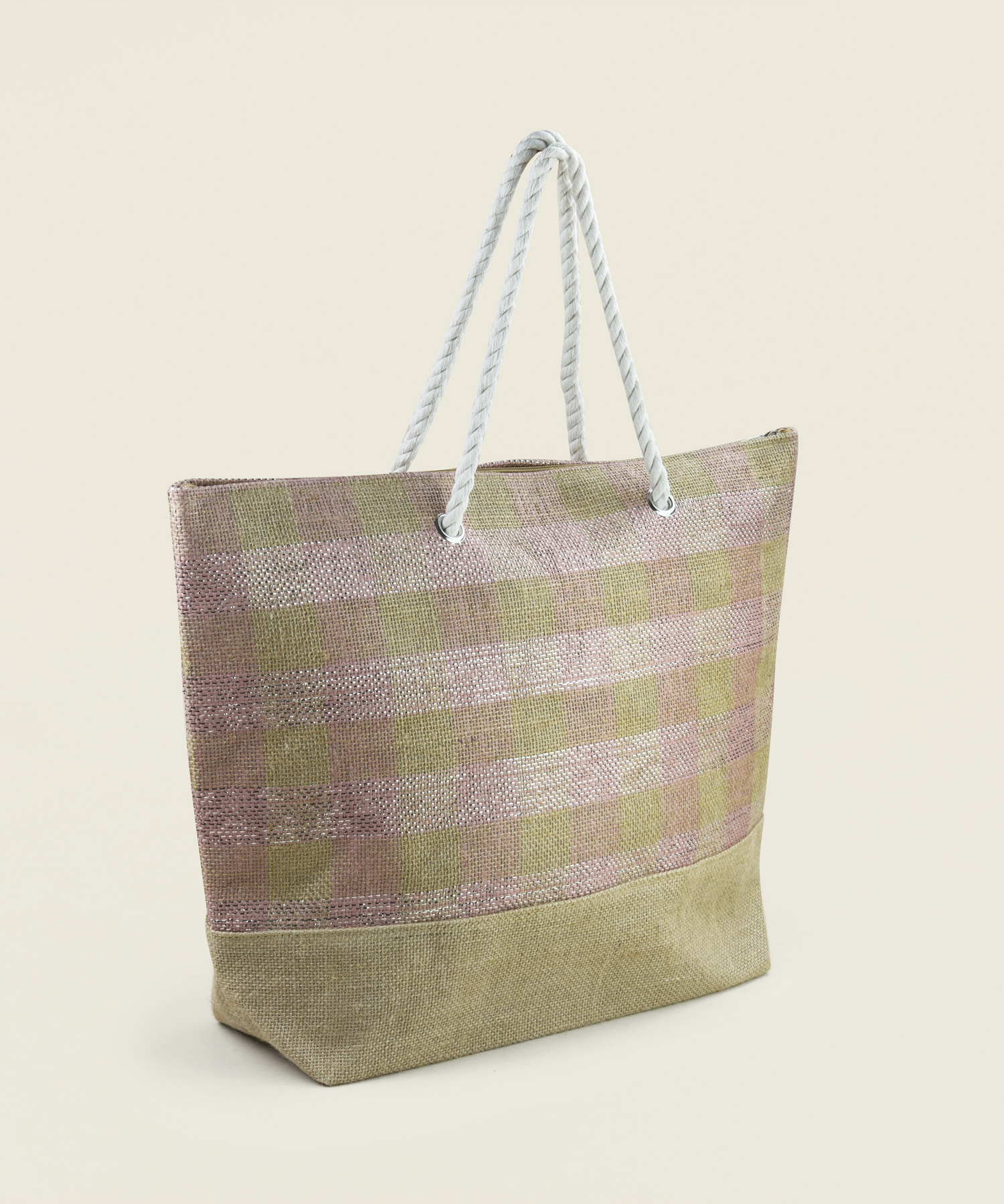 Τσάντα παραλίας από γιούτα με σχέδιο καρό σε ροζ-ασημί απόχρωση, διαστάσεων 53x40x15εκ.