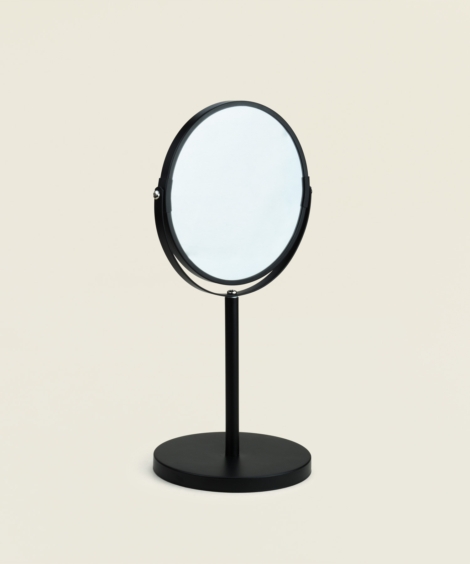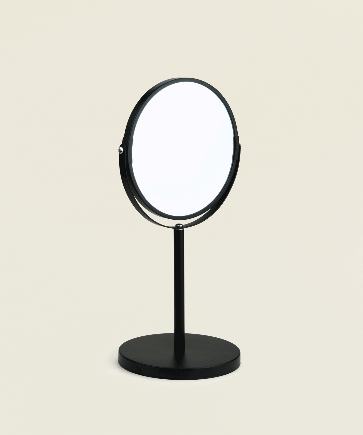 Επιτραπέζιος καθρέφτης διπλής όψης με μεταλλική βάση σε μαύρο χρώμα, ιδανικός για καθημερινή περιποίηση και μακιγιάζ.
