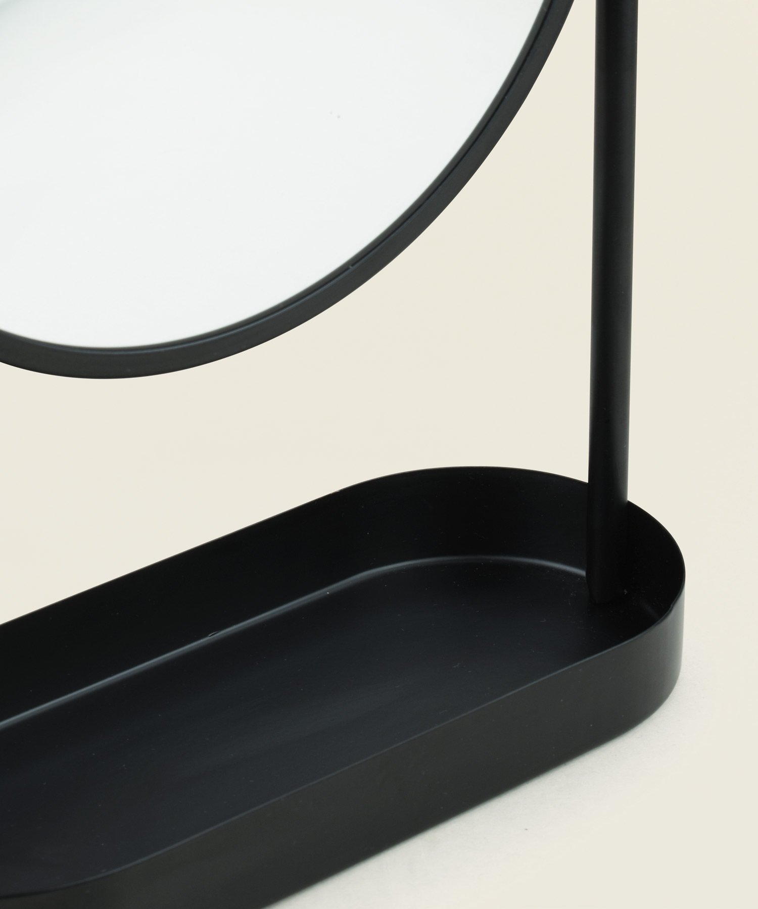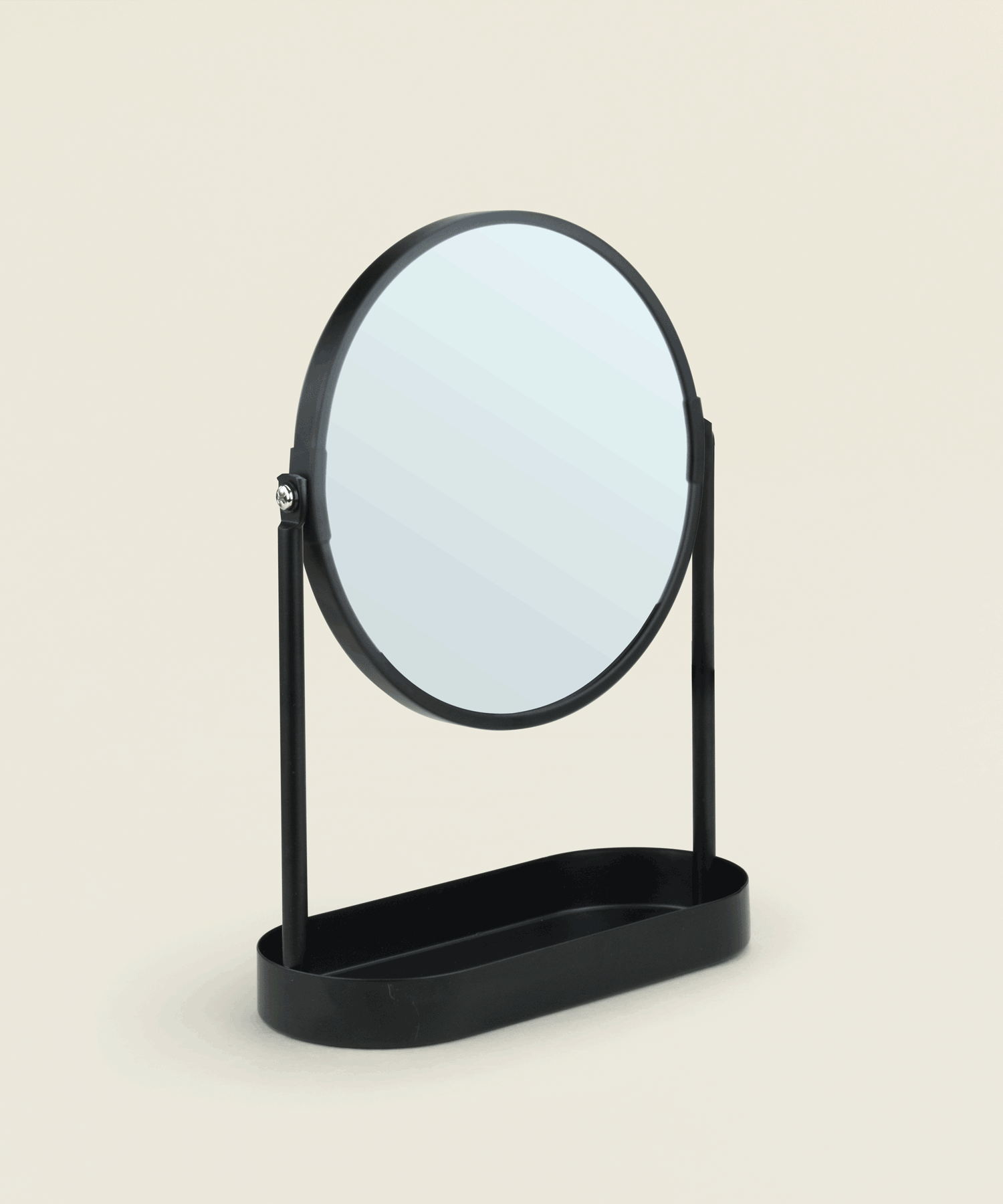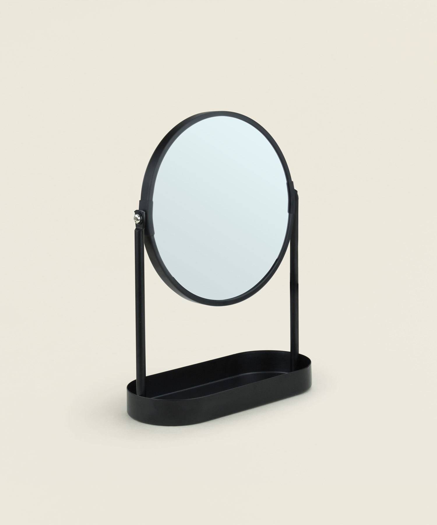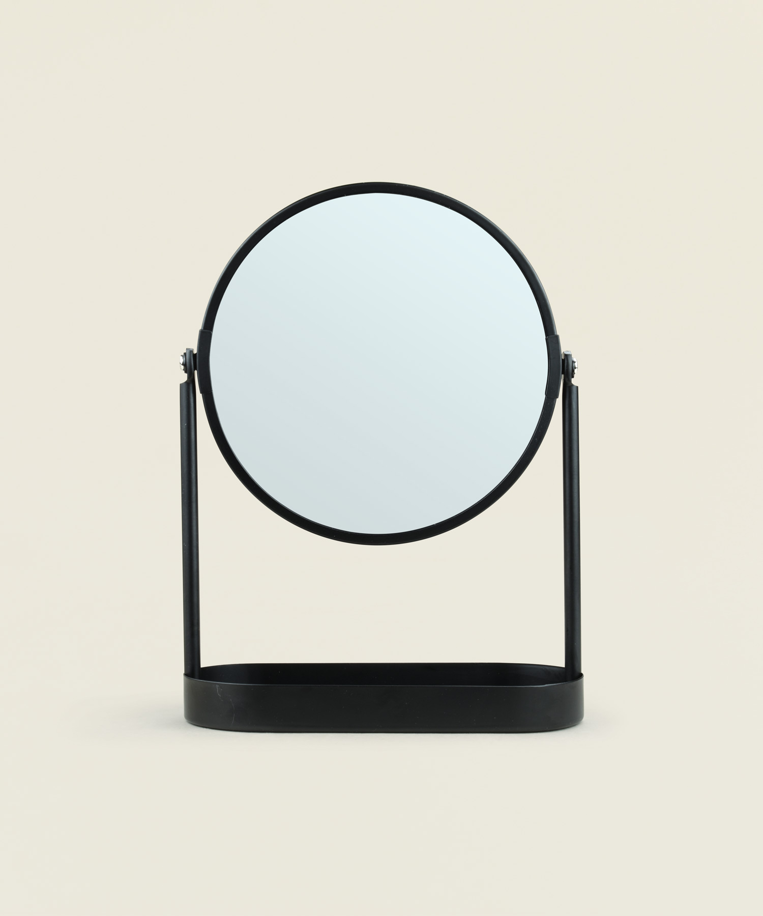 Επιτραπέζιος καθρέφτης διπλής όψης με μεταλλική βάση και αποθηκευτικό χώρο, ιδανικός για καθημερινή περιποίηση.