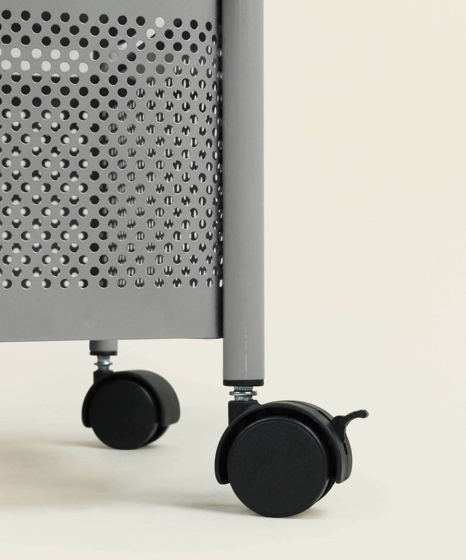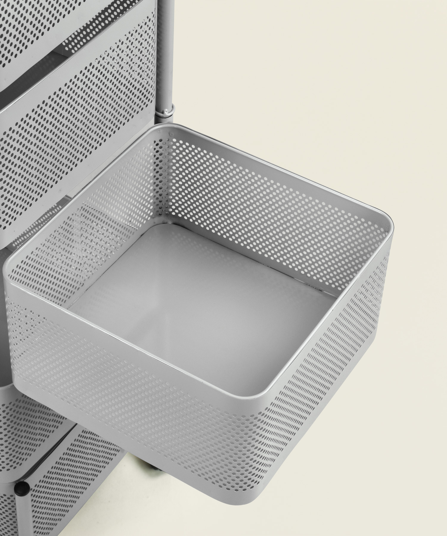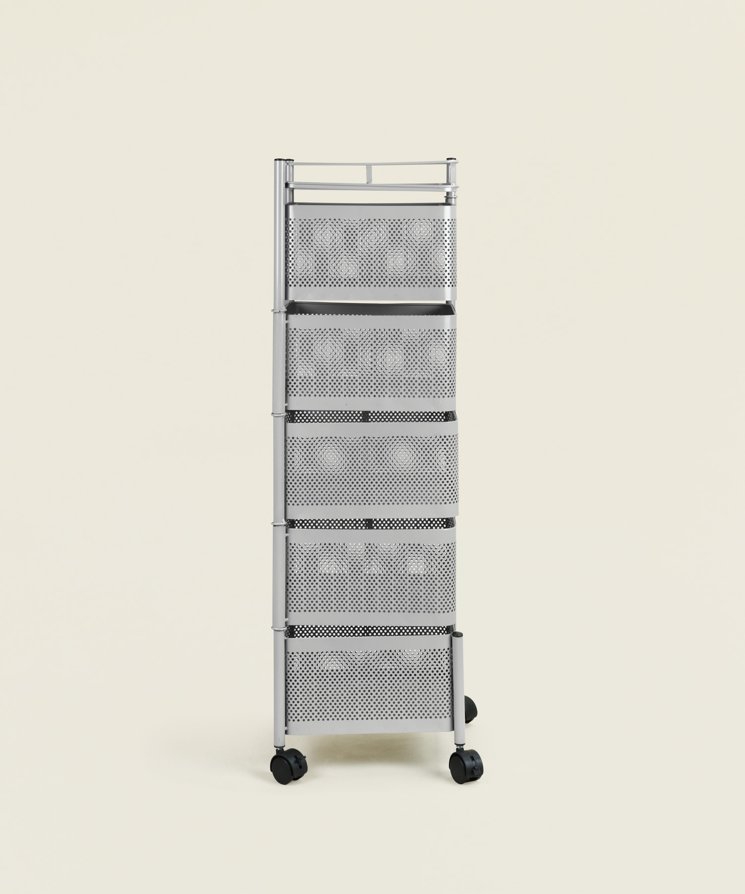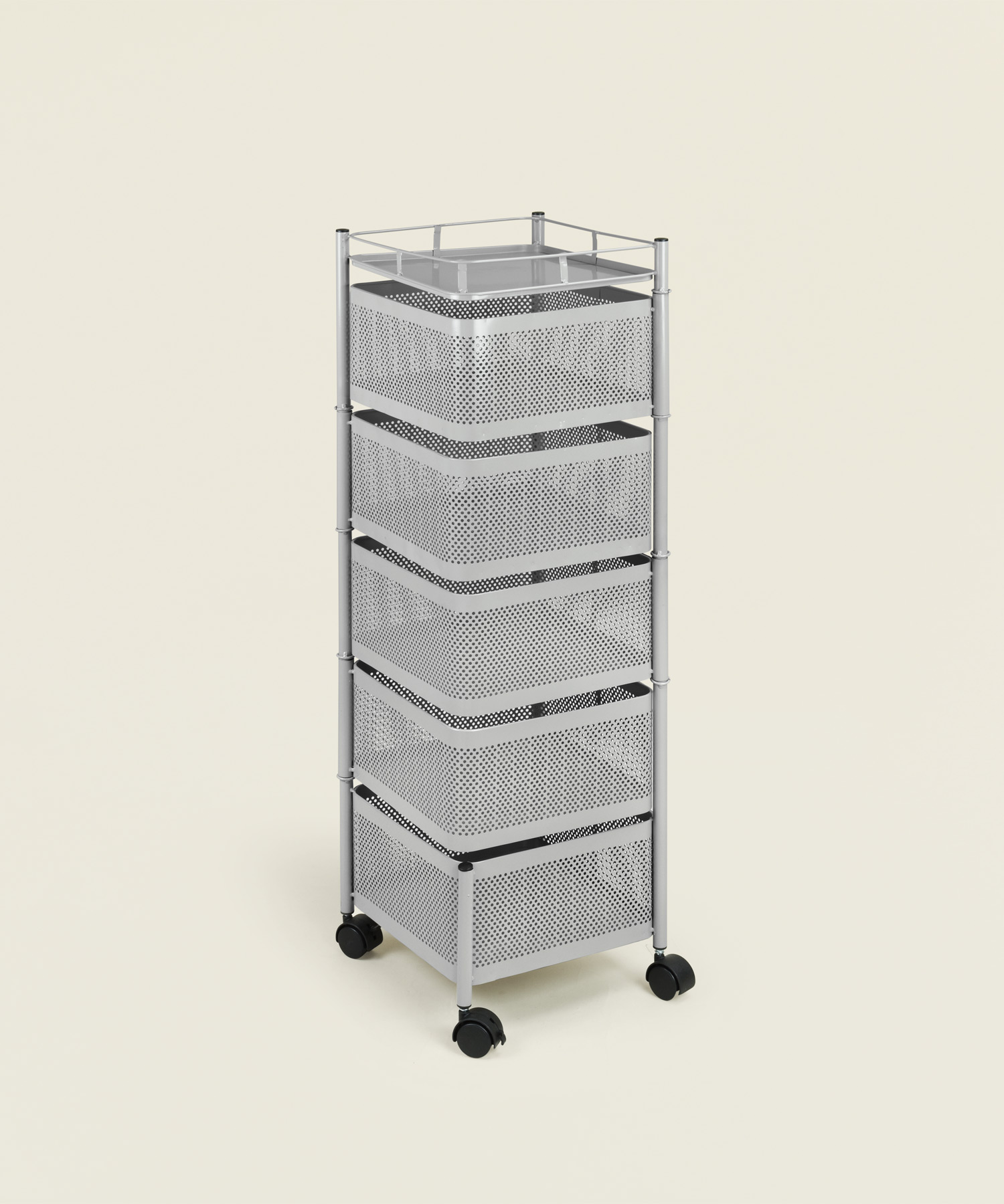 Τρόλευ αποθήκευσης μεταλλικό, με πέντε καλάθια τα οποία ανοίγουν και κλείνουν για ευκολία κατά τη χρήση του. Διαθέτει μεταλλικό στοπ στις δύο από τις τέσσερις ρόδες και είναι ιδανικό για μεταφορά και οργάνωση αντικειμένων.