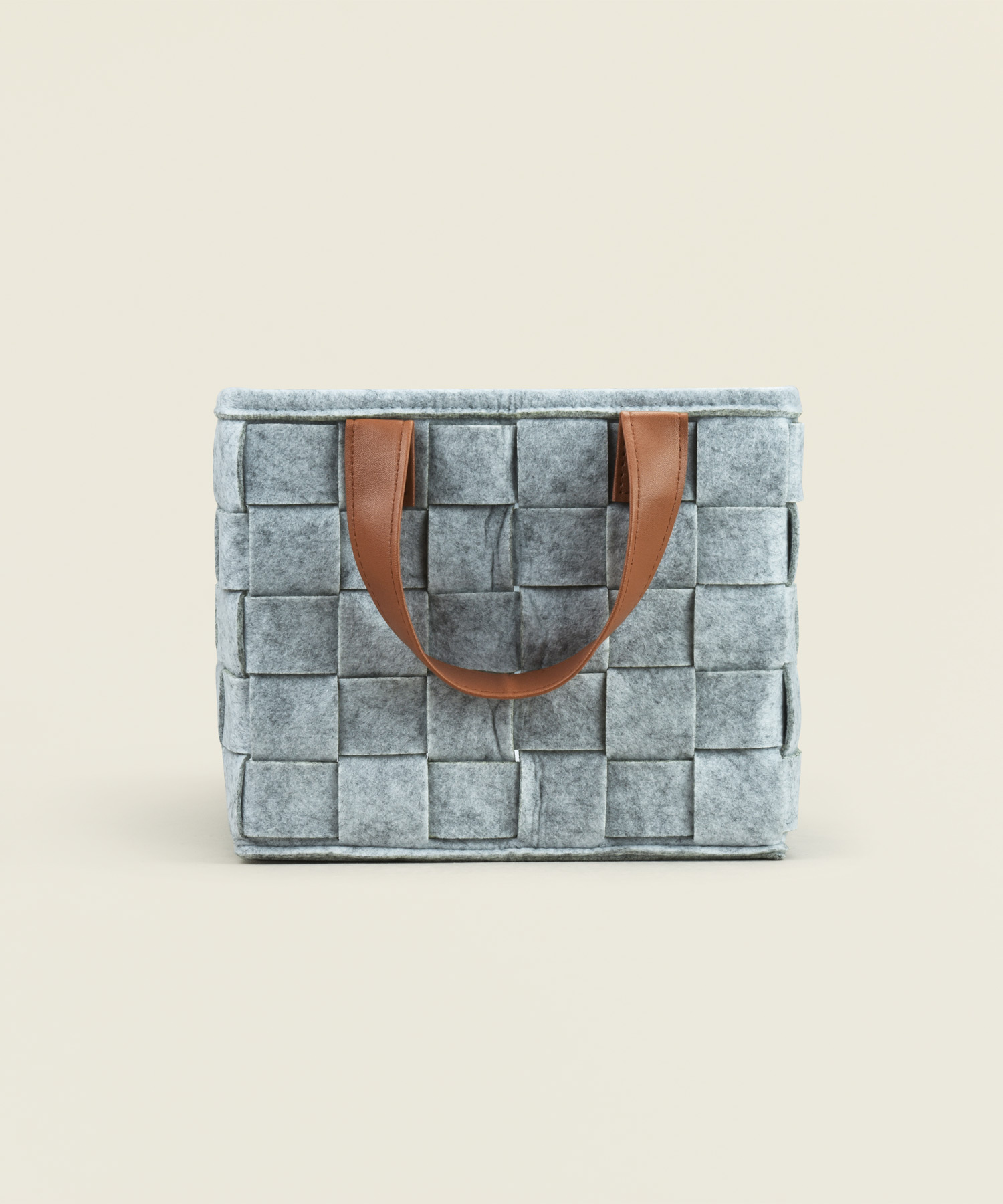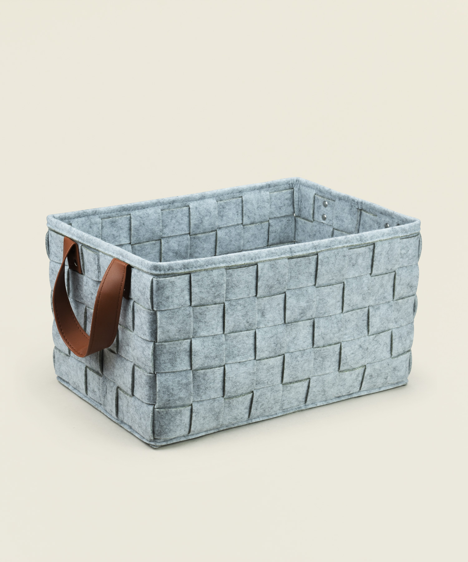Υφασμάτινο καλάθι αποθήκευσης σε γκρι χρώμα με πλεκτή υφή και δερμάτινες λαβές, ιδανικό για οργάνωση και διακόσμηση.