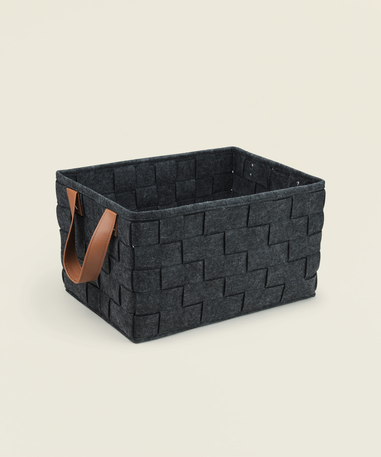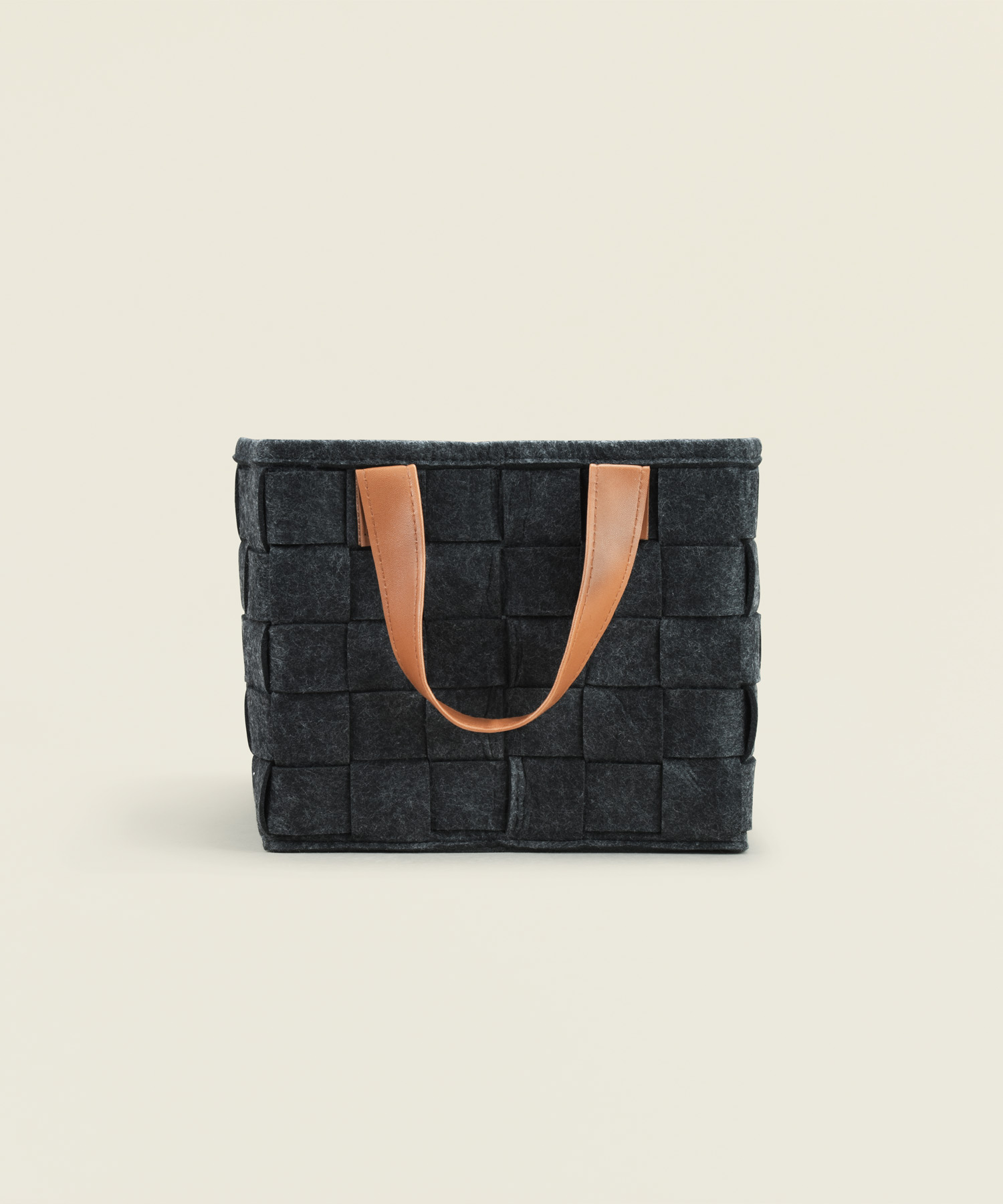 Υφασμάτινο καλάθι αποθήκευσης με πλεκτή υφή και δερμάτινες λαβές, ιδανικό για οργάνωση μικρότερων αντικειμένων με στυλ.
