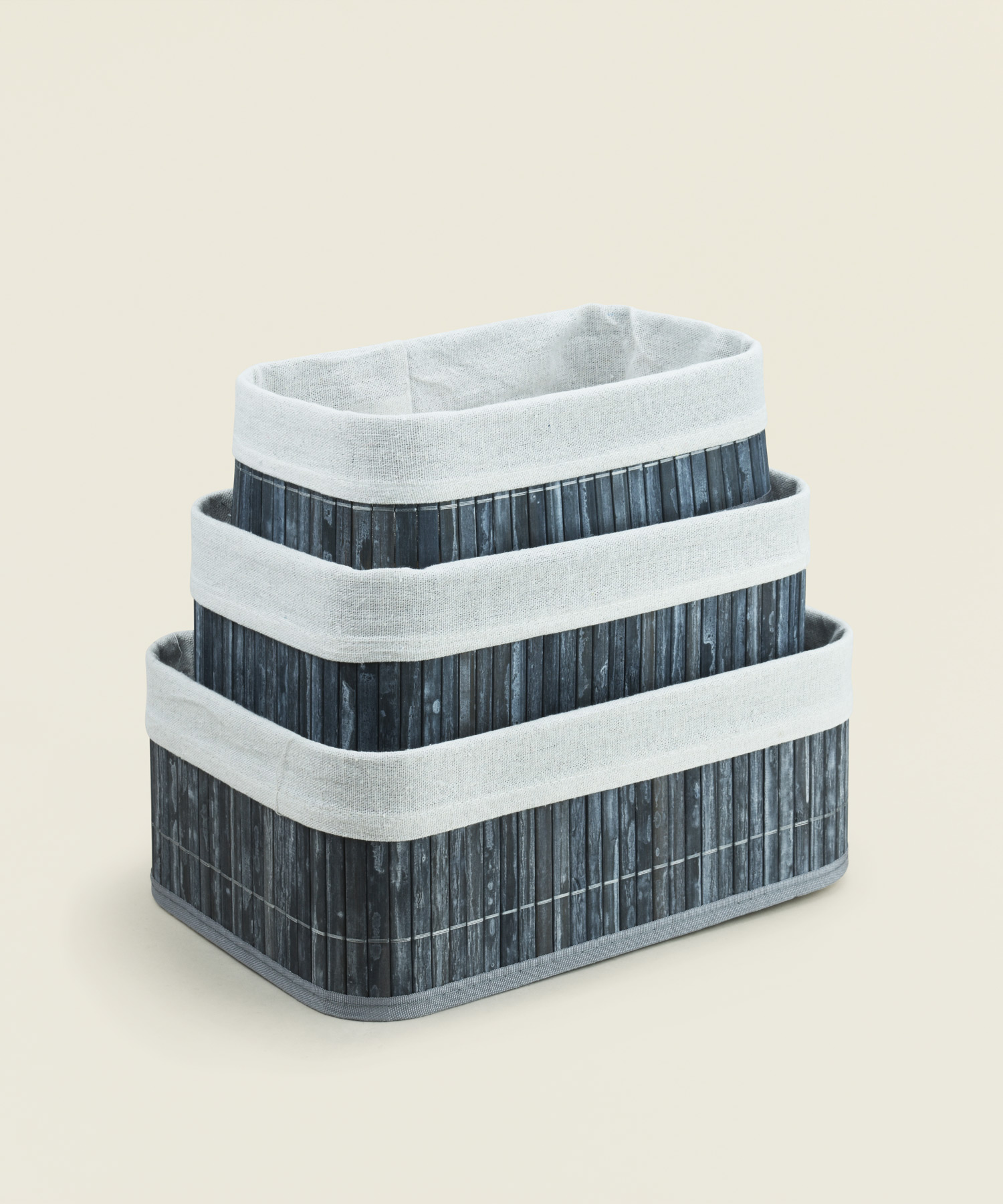 Σετ 3 καλαθιών από μπαμπού με υφασμάτινη επένδυση, ιδανικά για αποθήκευση και οργάνωση σε κάθε χώρο του σπιτιού.
