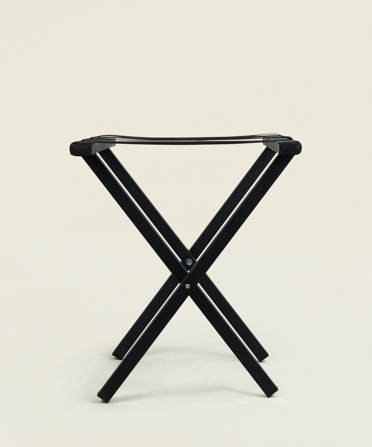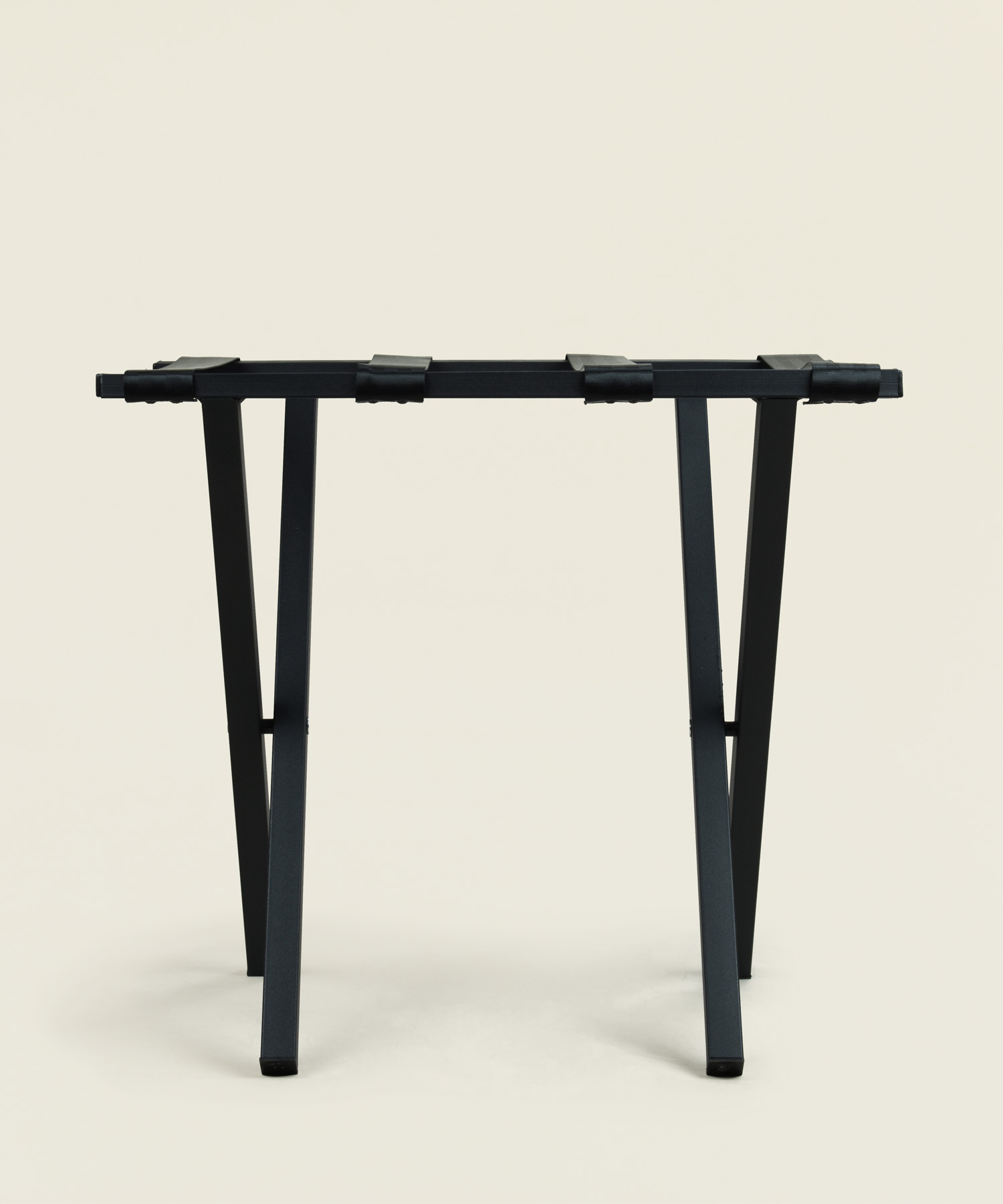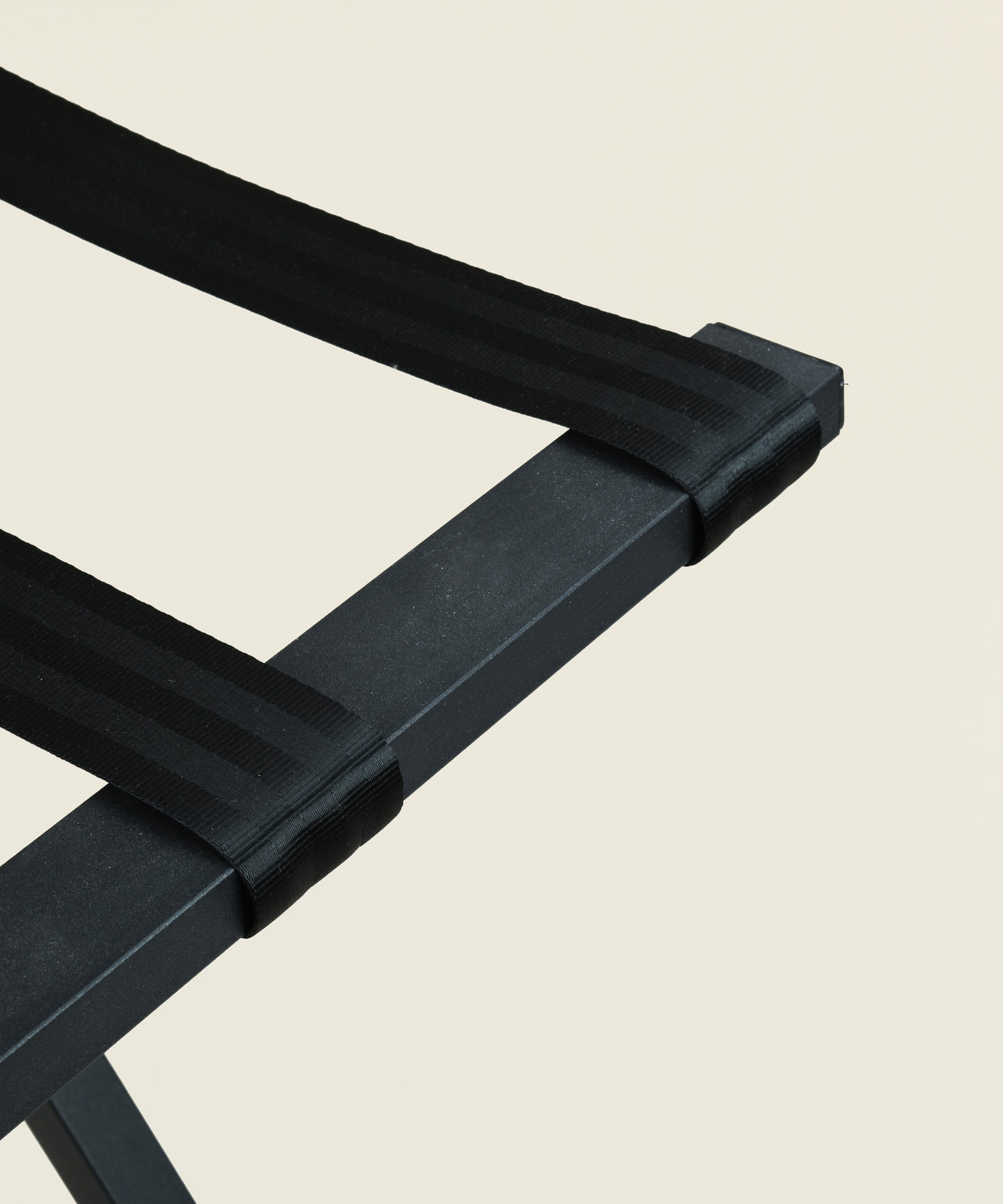 Πτυσσόμενη βάση για βαλίτσες με μεταλλικό σκελετό και υφασμάτινους ιμάντες σε μαύρο χρώμα, ιδανική για καθημερινή χρήση.