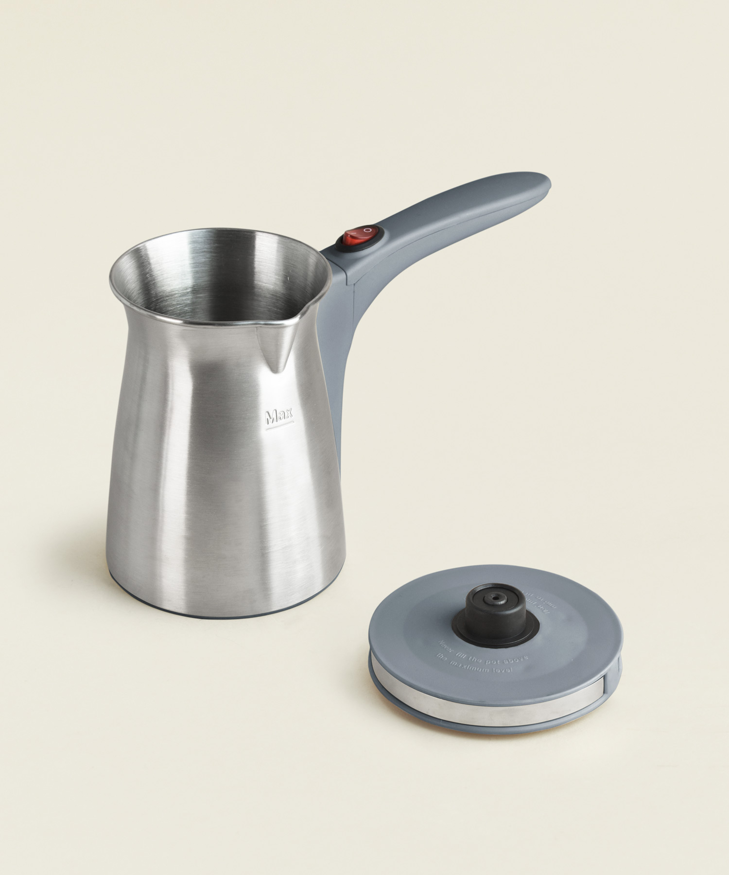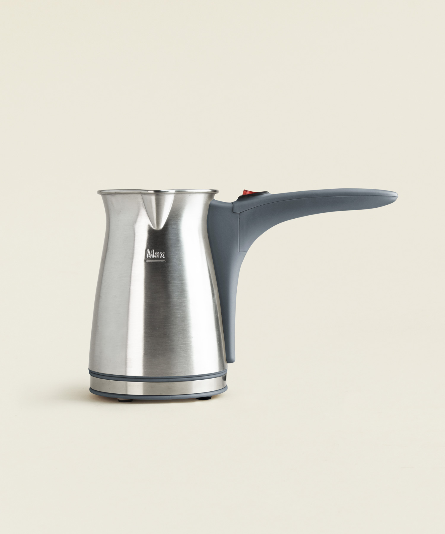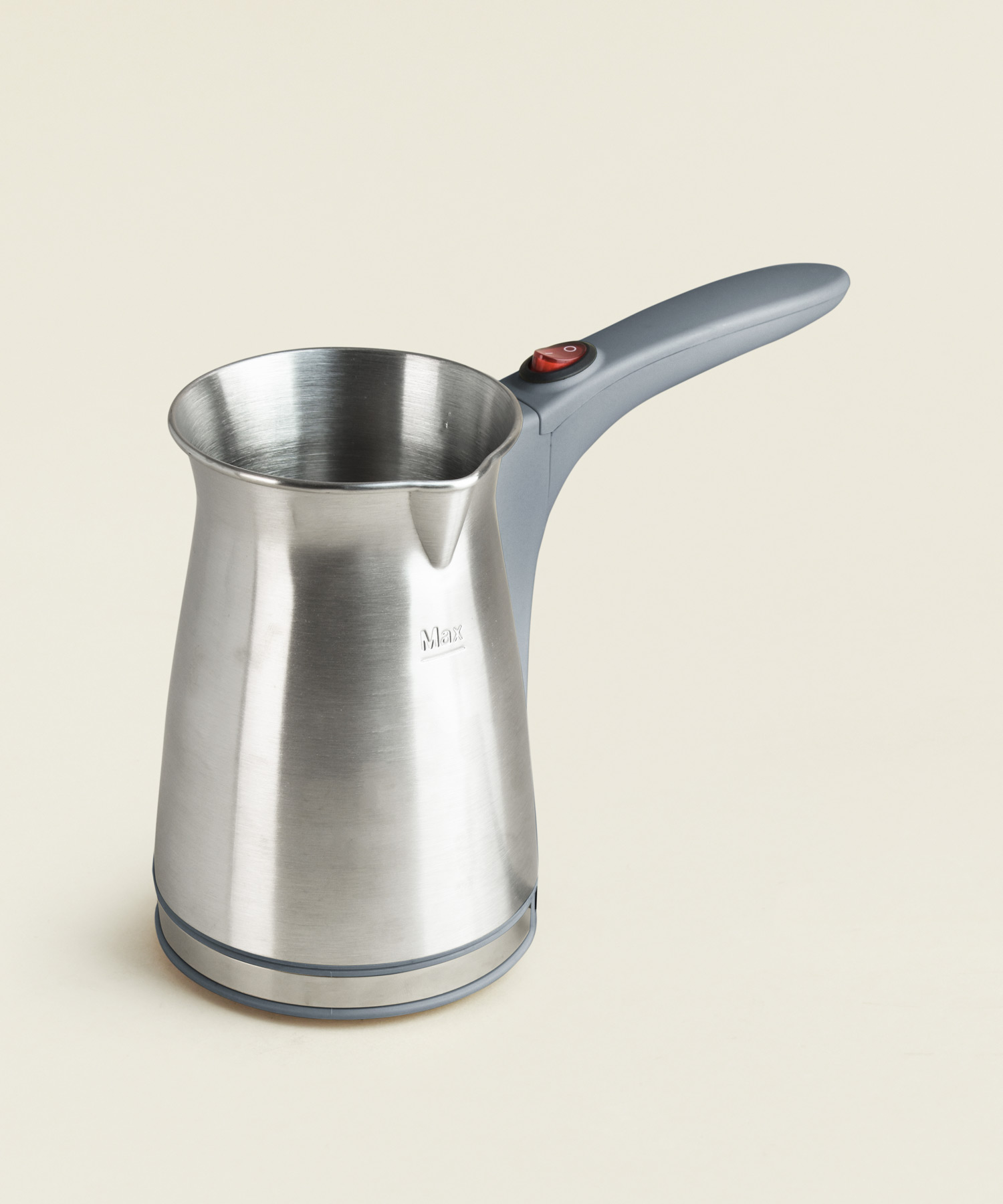 Ηλεκτρικό μπρίκι από ανοξείδωτο ατσάλι, κατάλληλο για παρασκευή ελληνικού καφέ και ζεστού νερού στην καθημερινή προετοιμασία του πρωινού.