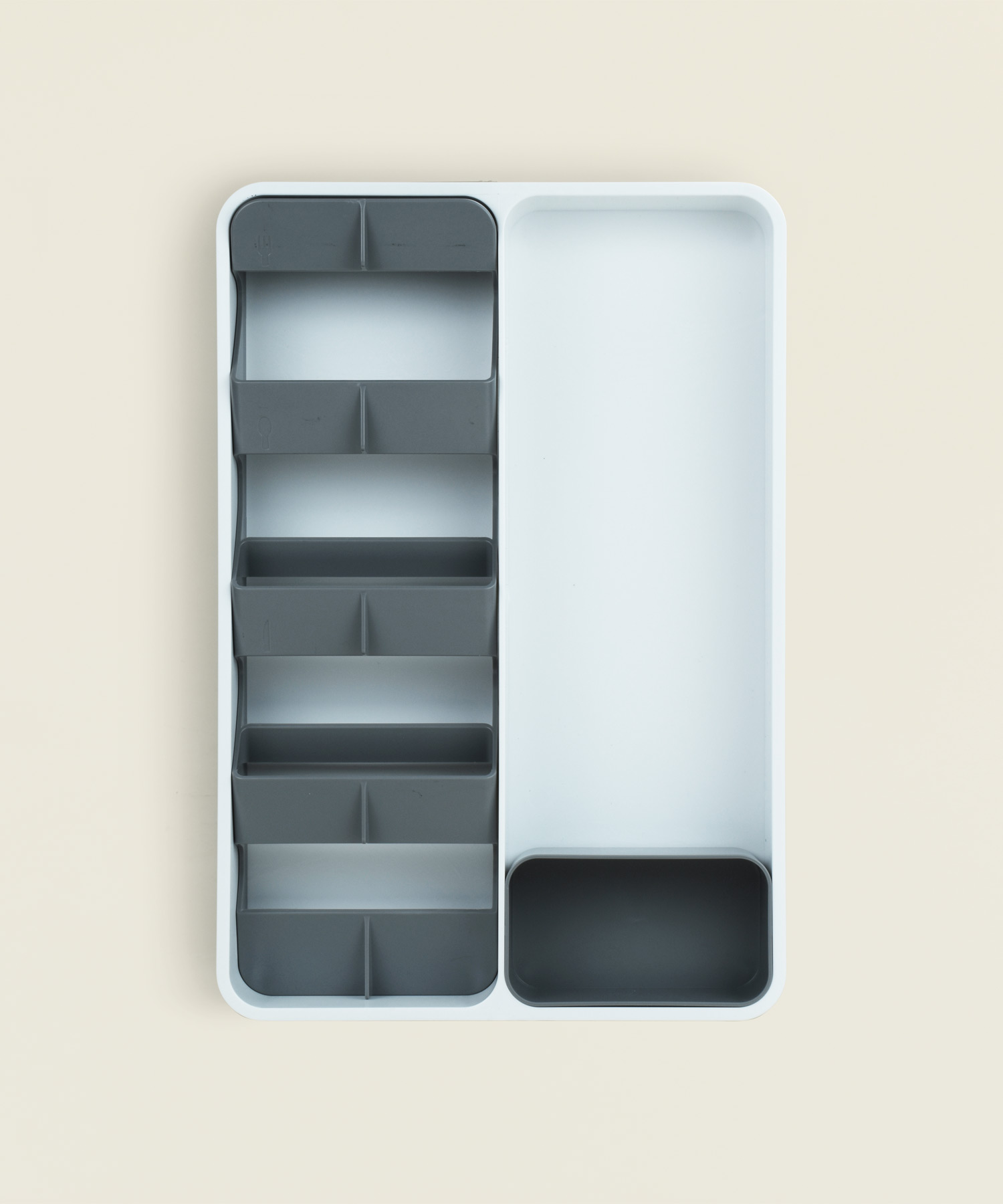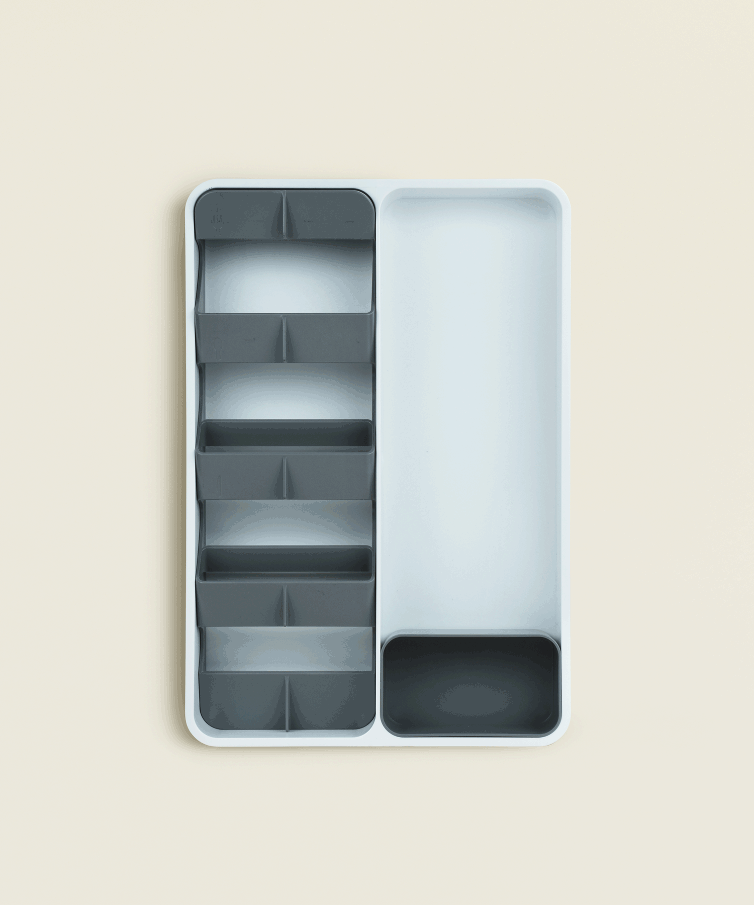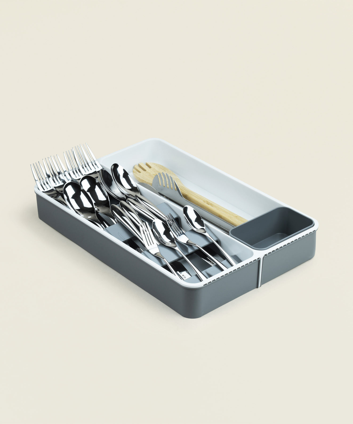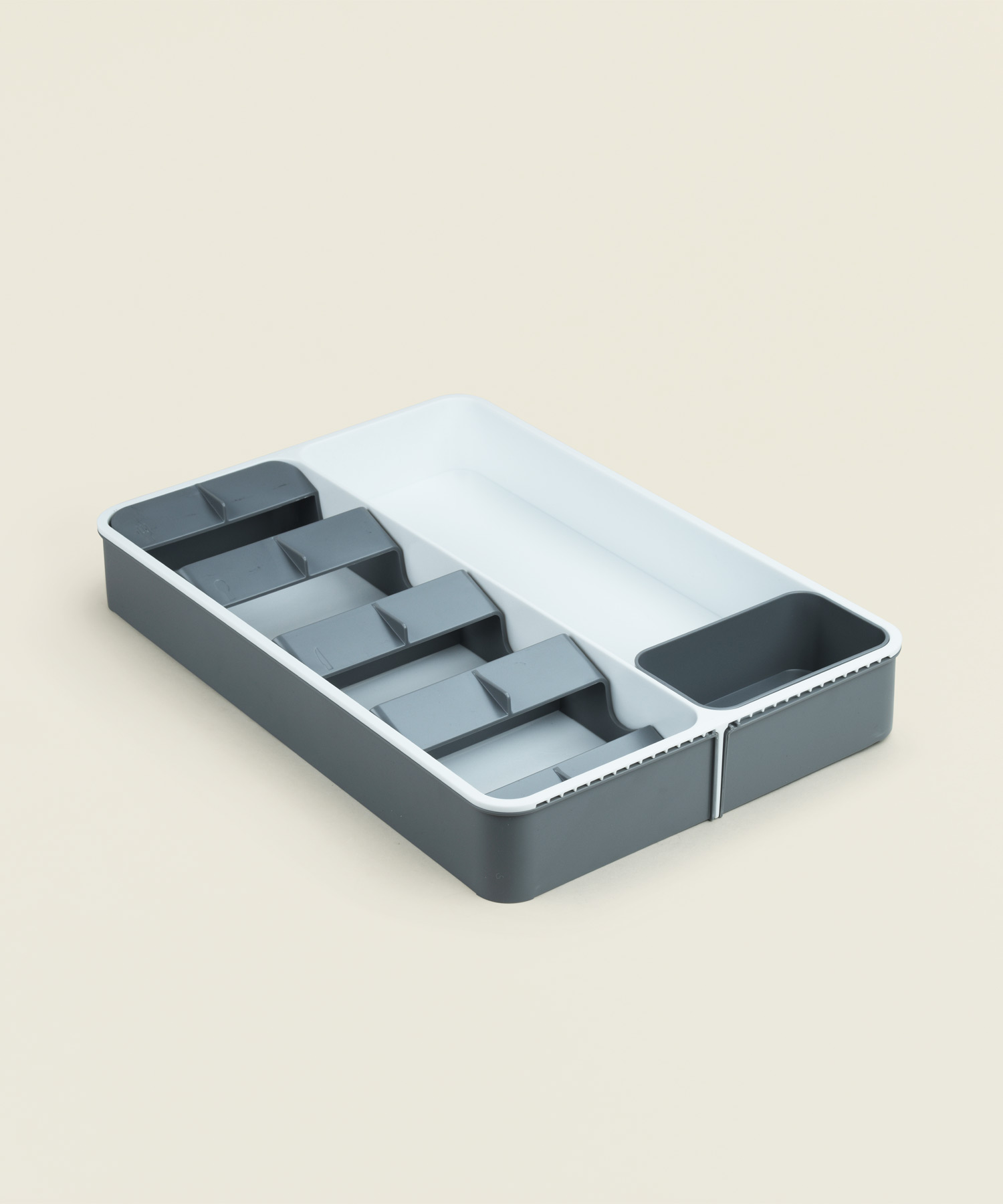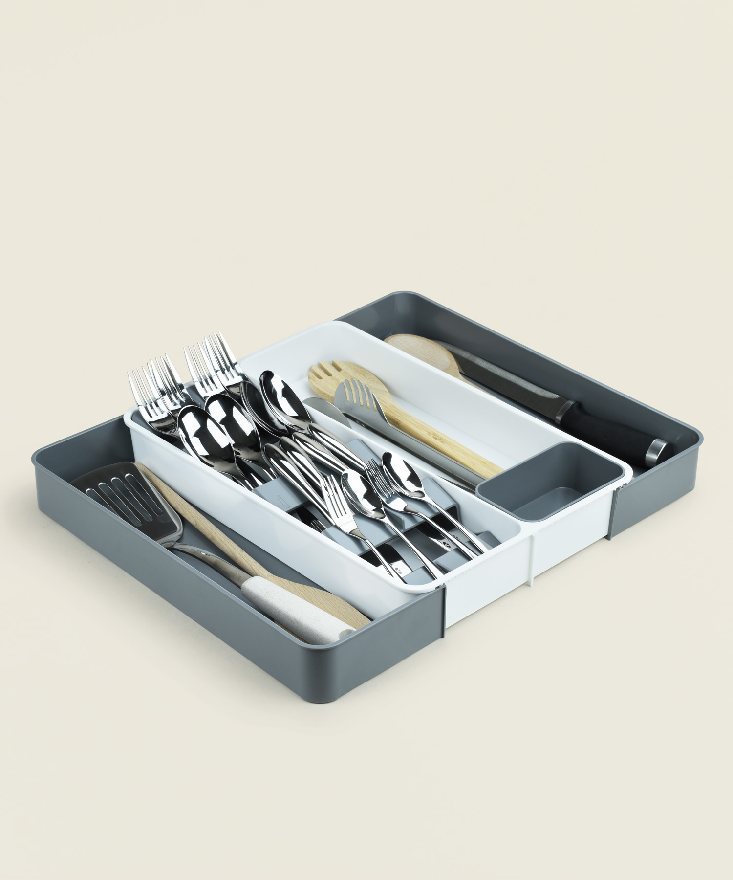 Επεκτεινόμενη πλαστική κουταλοθήκη που προσαρμόζεται στο πλάτος του συρταριού, προσφέροντας άνετο χώρο για μαχαιροπίρουνα και μεγαλύτερα σκεύη κουζίνας. Διαθέτει πολλαπλές θήκες και αποσπώμενα χωρίσματα για ευέλικτη και οργανωμένη τακτοποίηση.