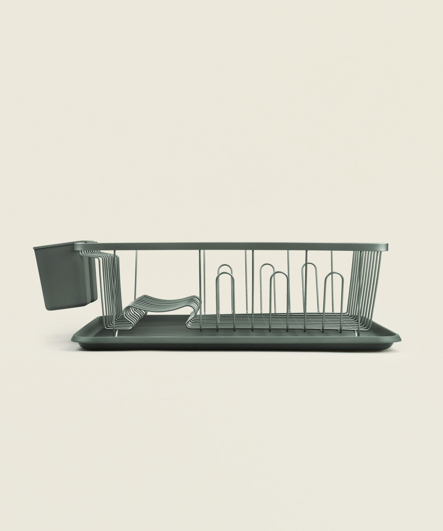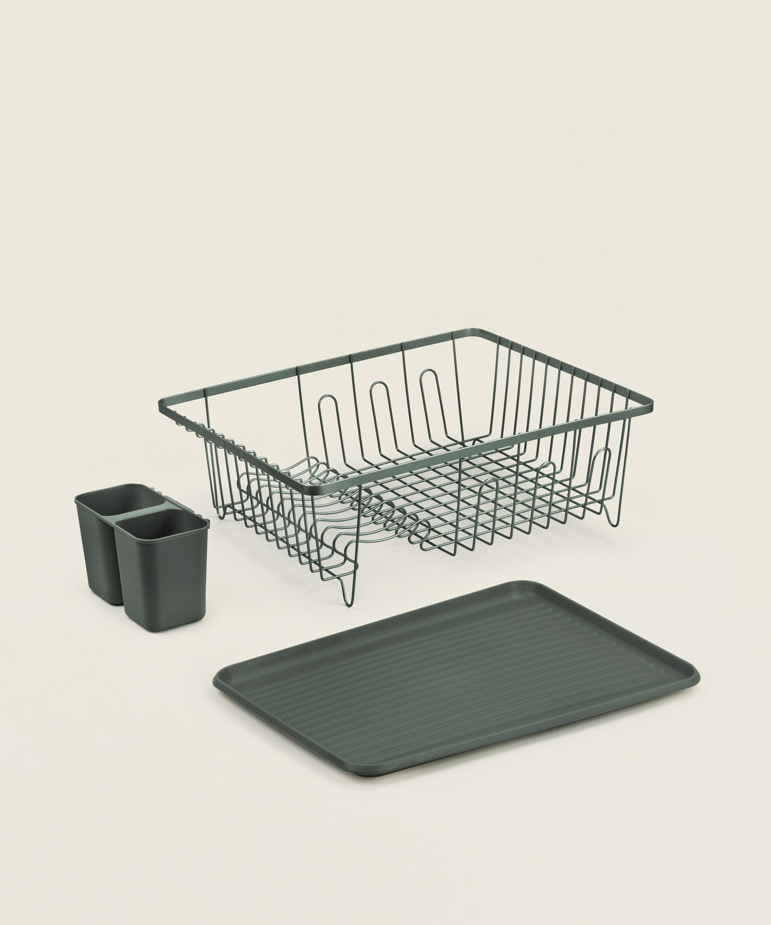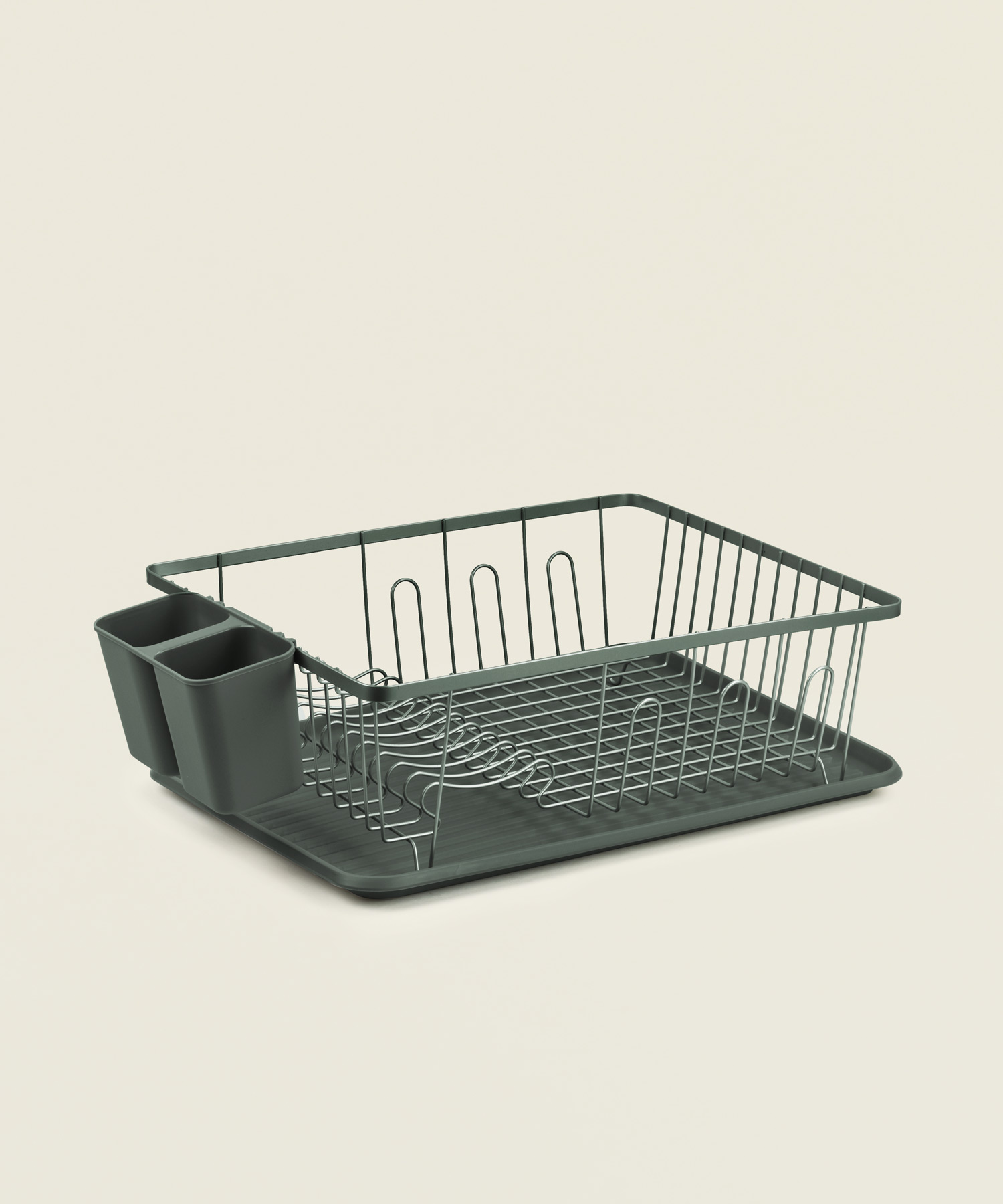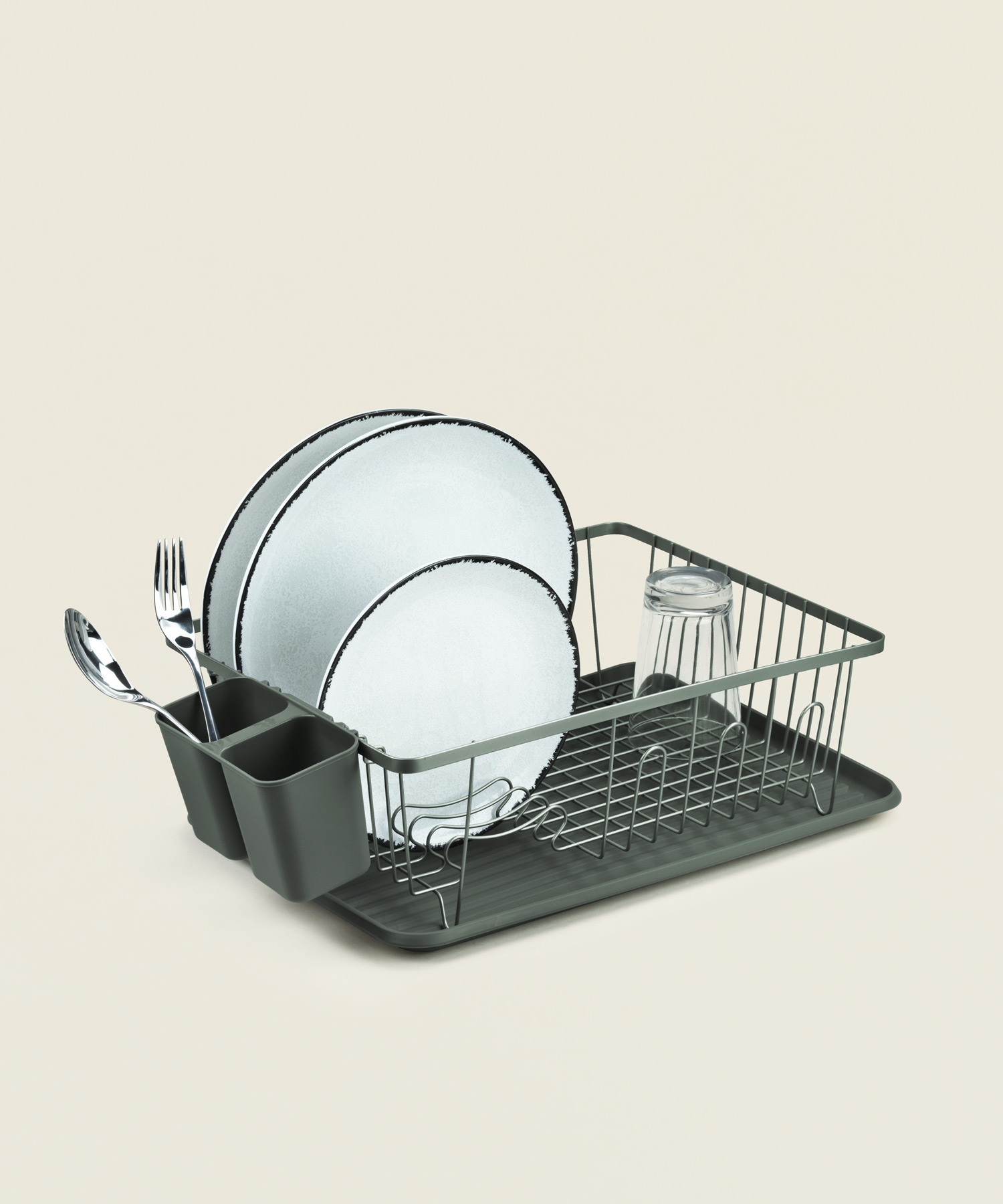 Μεταλλική πιατοθήκη κουζίνας με πλαστικό δίσκο συλλογής νερού και αποσπώμενη θήκη για μαχαιροπίρουνα, σχεδιασμένη για καθημερινό στέγνωμα και οργάνωση πιάτων και σκευών.
