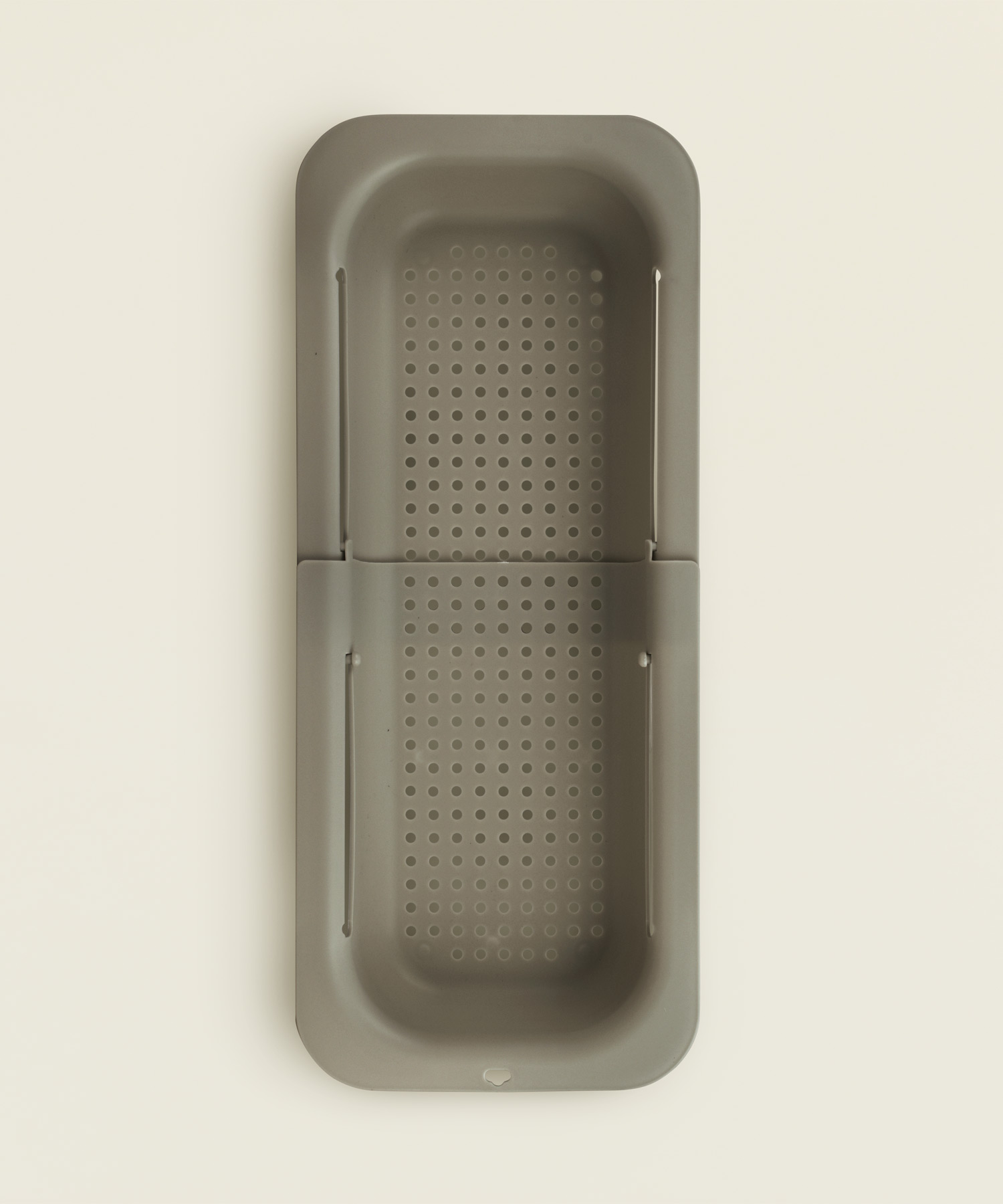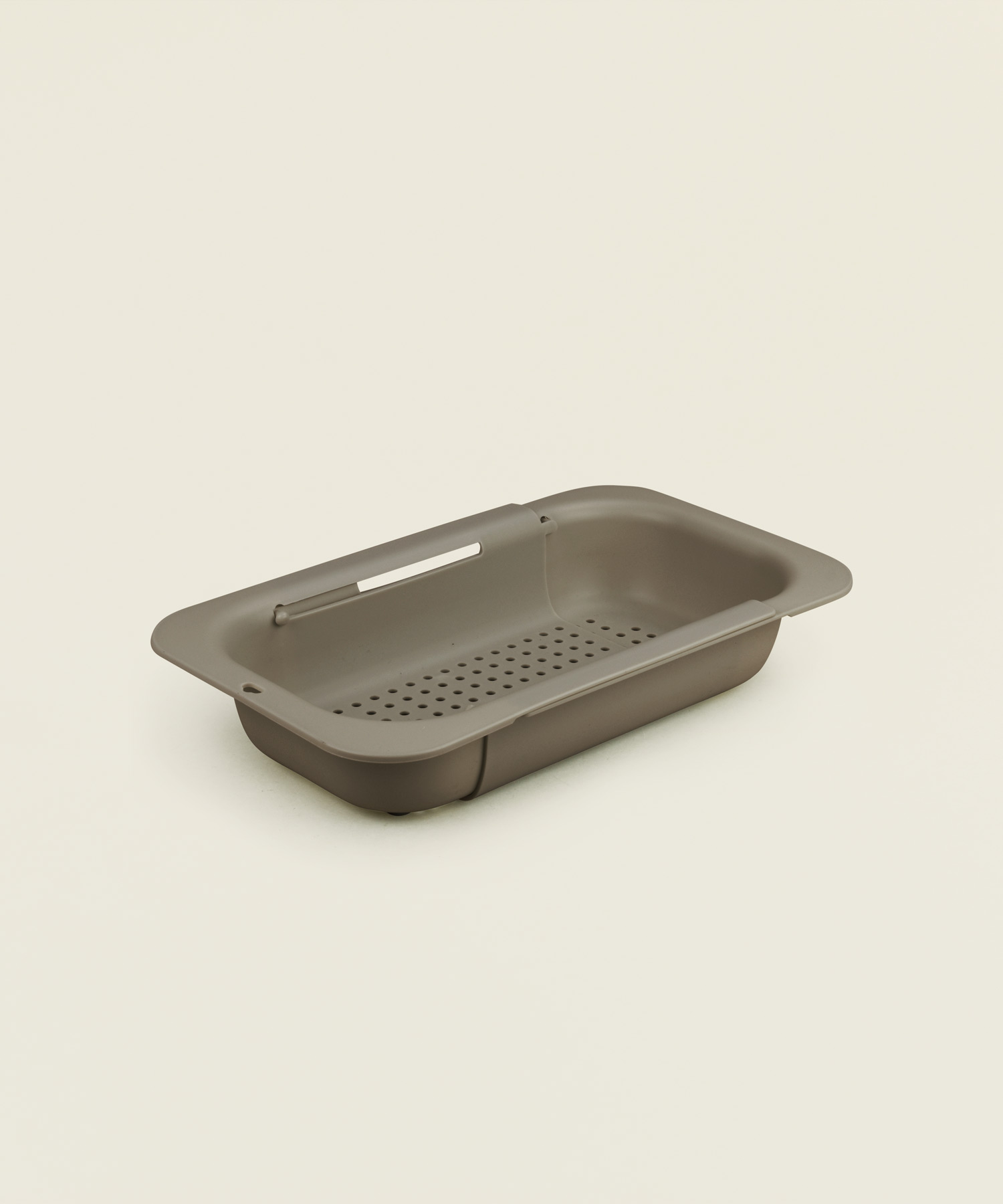 Επεκτεινόμενο πλαστικό στραγγιστήρι σε χρώμα moka, ιδανικό για το στέγνωμα φρούτων, λαχανικών και μικρών σκευών. Ρυθμίζεται εύκολα από 34,5 έως 47,8 εκ., ώστε να ταιριάζει σε διαφορετικά μεγέθη νεροχυτών.