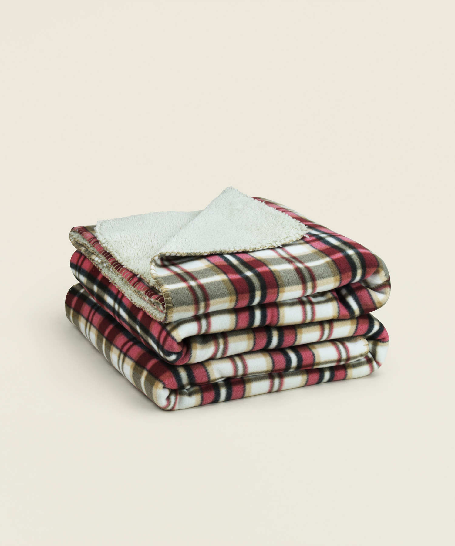 Διπλή κουβέρτα σέρπα polar velvet με απαλή, διπλής όψης υφή και καρώ σχέδιο σε απόχρωση μπεζ – μπορντώ, ιδανική για ζεστασιά τους χειμερινούς μήνες.