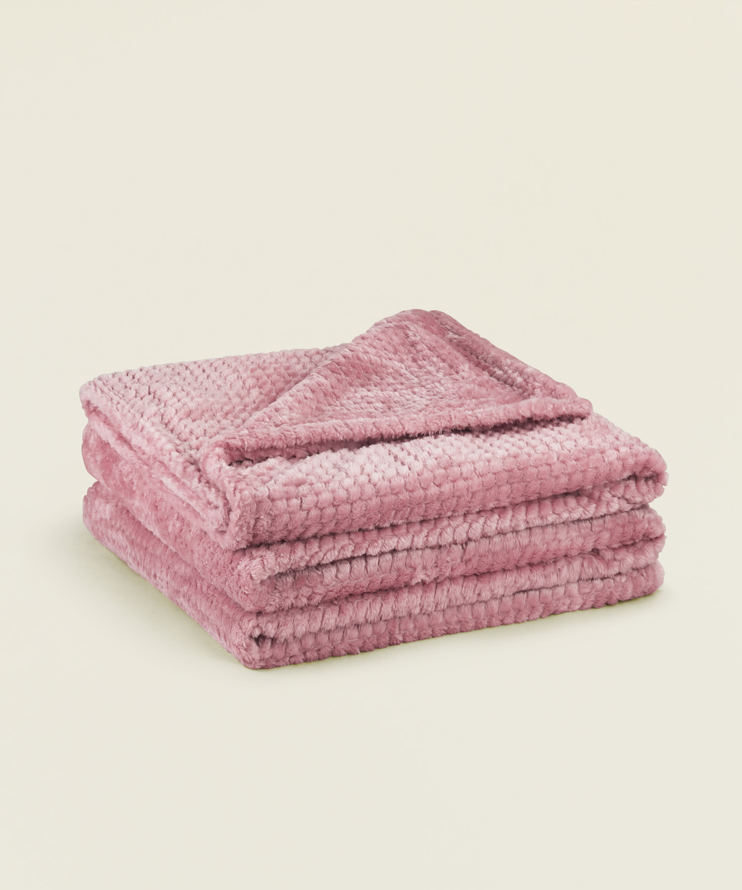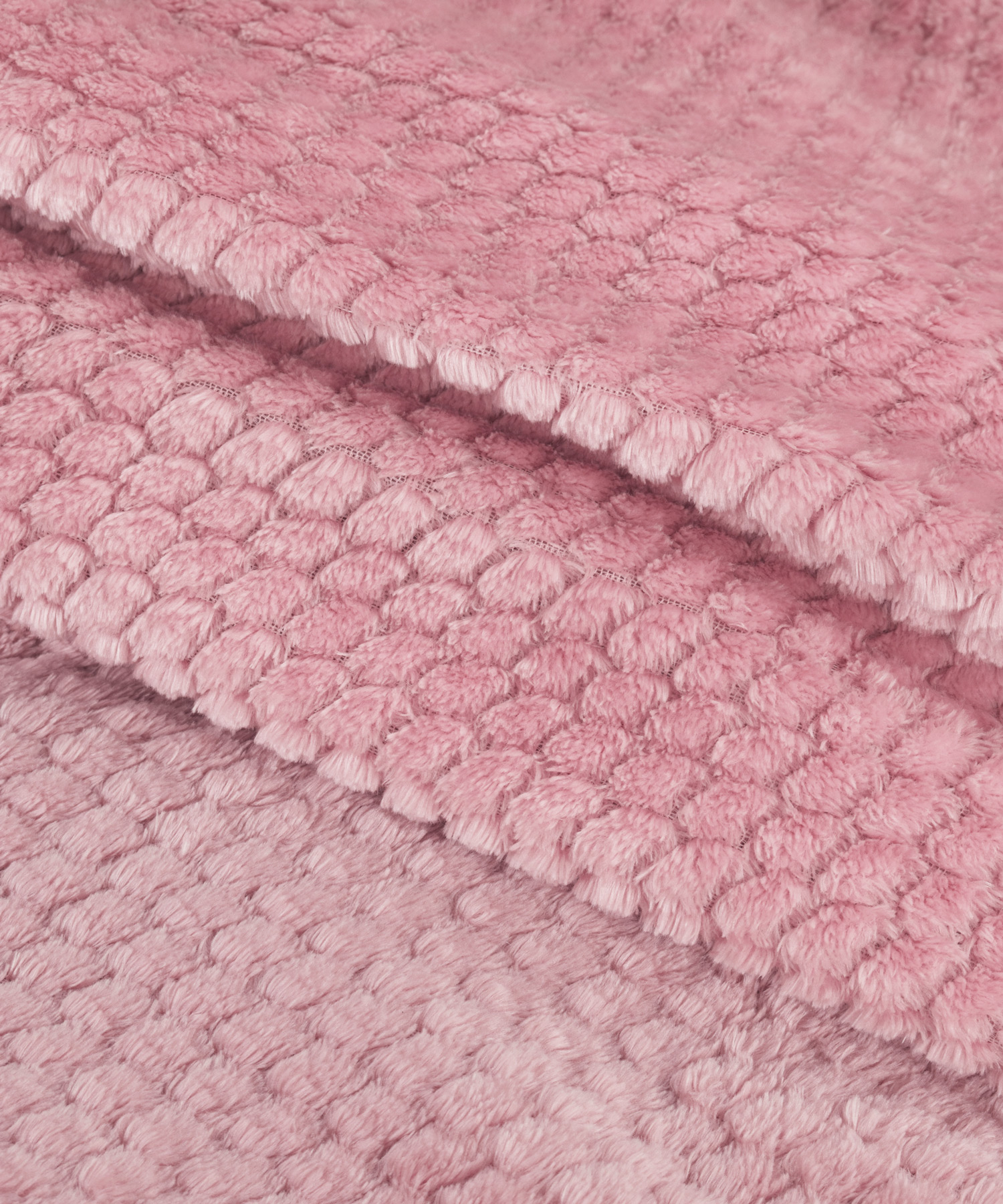 Μαλακή κουβέρτα flannel με ανάγλυφο σχέδιο honeycomb σε γλυκιά ροζ απόχρωση, ιδανική για ζεστασιά και διακόσμηση σε διπλό κρεβάτι.