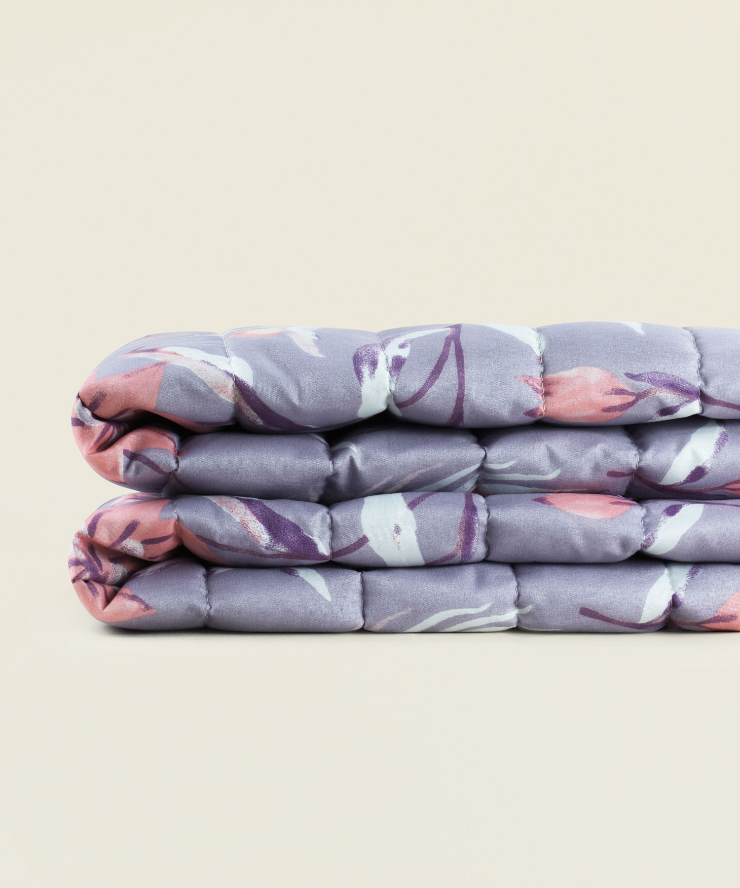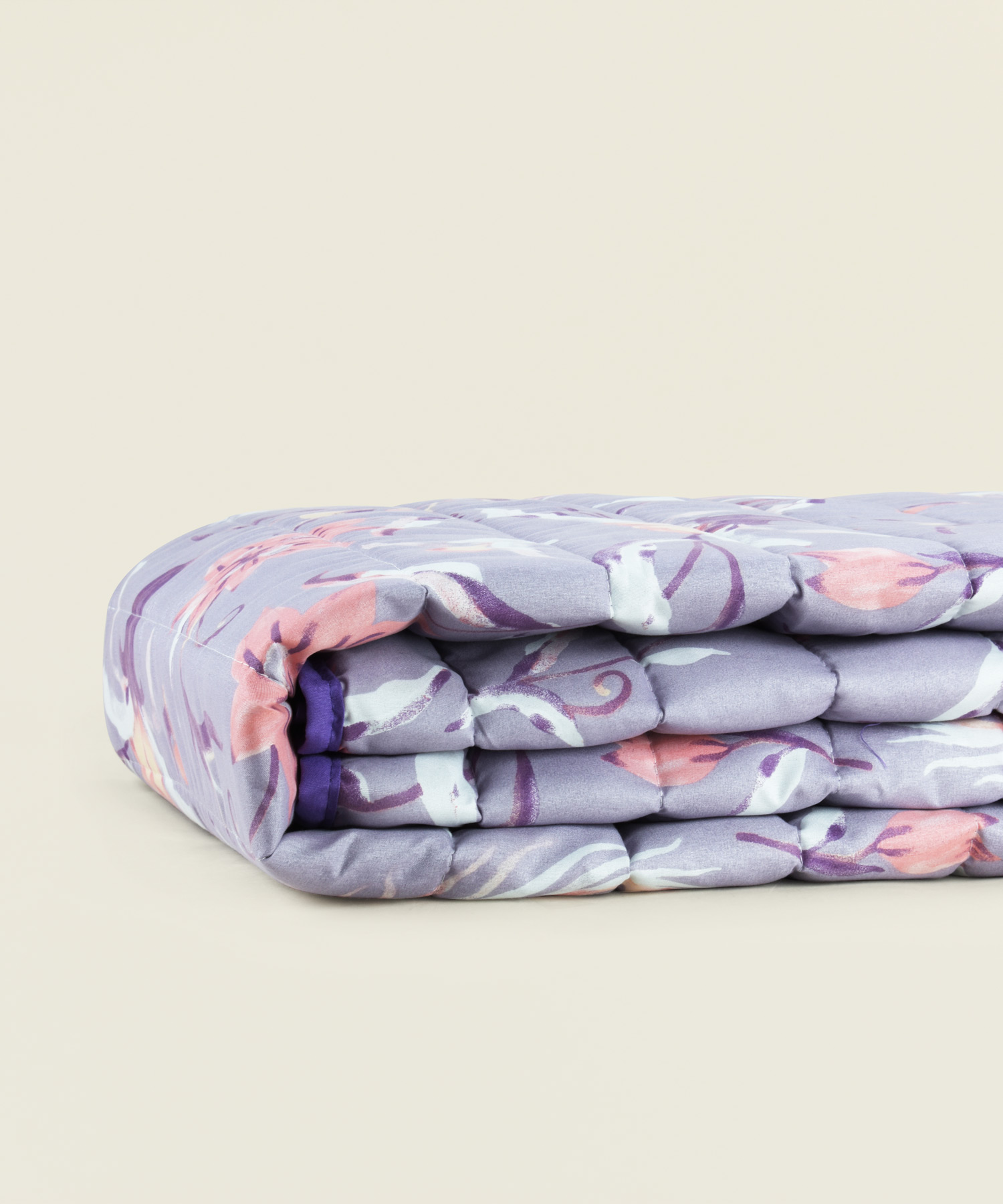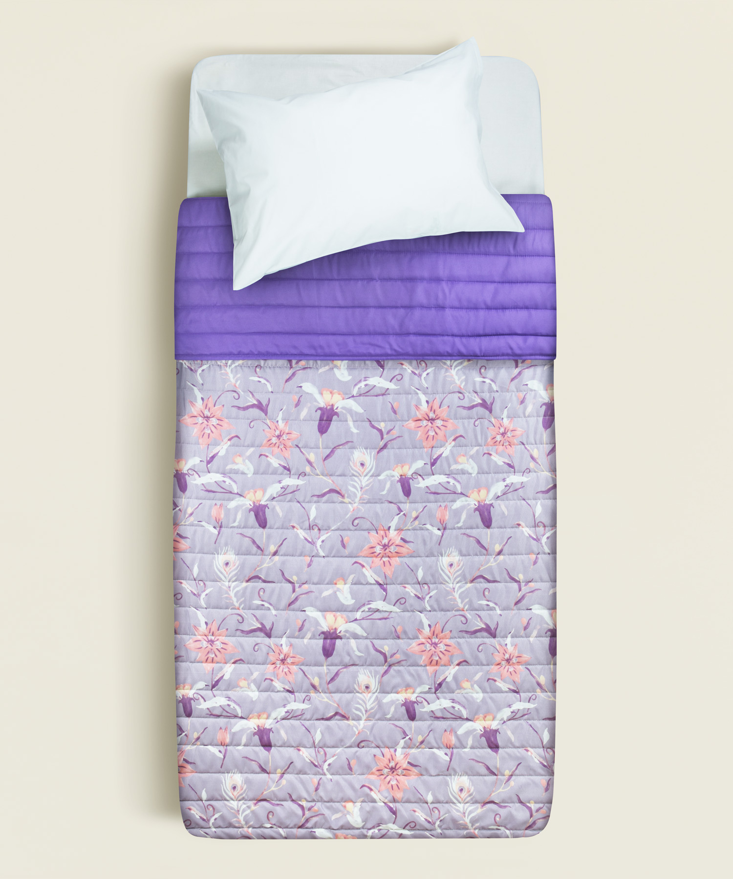 Ελαφρύ μονό πάπλωμα 160×240εκ. από μικροΐνες με σχέδιο λιλά λουλούδια, ιδανικό για καθημερινή χρήση και άνετο ύπνο όλες τις εποχές.